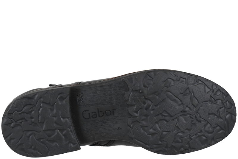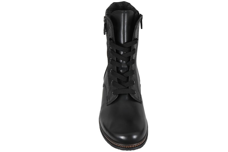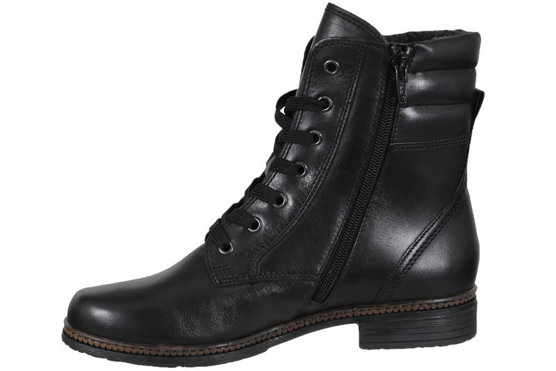 Super smart støvle fra Gabor til dame. Støvlen er lavet af sort glat skind, og har sorte snørebånd op langs støvlen, så den kan tilpasses efter foden. På begge sider har støvlen en lynlås, så den er nem at komme af og i. Indvendigt er støvlen let foret med grå foer. Indlægssålen er af grå filt. Støvlens sål er lavet af sort gummi. En super smart støvle til dame.