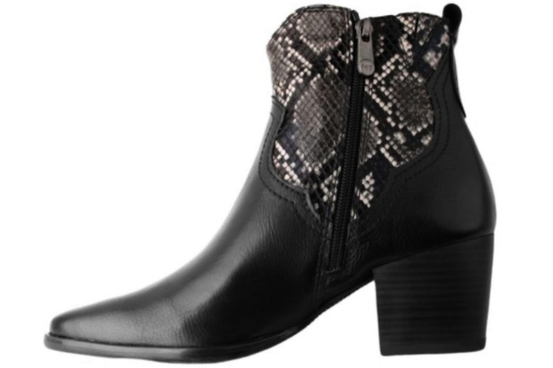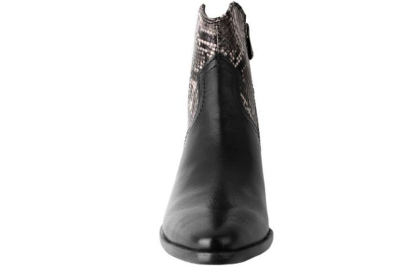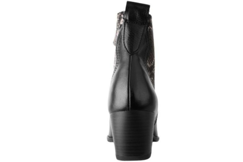 Super smart støvle fra Marco Tozzi. Støvlen er lavet i galt sort tekstil. På begge sider af skaftet er der snake print, som giver en støvlen en flot detalje. På indersiden er der en lynlås, så den er let at komme i og af. Indvendig er skoen foret med sort tekstil og har en feel me dæksål, så den er blød at gå på. Støvlen har en hæl på 6 cm. Slidsålen er en sort gummi sål, så den er slidstærk. Rigtig flot støvle der kan bruges til meget.