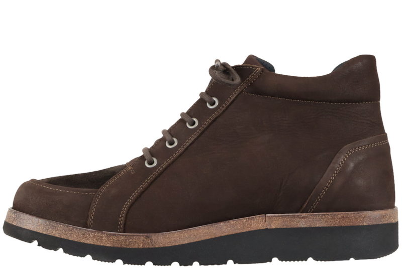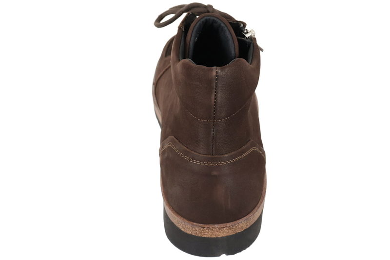 Brun støvle i oileret nubuck fra New Feet. Støvlen har brune snørebånd foran og lynlås på indersiden i sølv. Mellemsålen er i brunt kork og slidsålen er i EVA-skum. Super smart og behaglig støvle. Den har ingen indvendige syninger og indlægsålen er udtagelig, hvis man har behov for at bruge sit eget indlæg.
