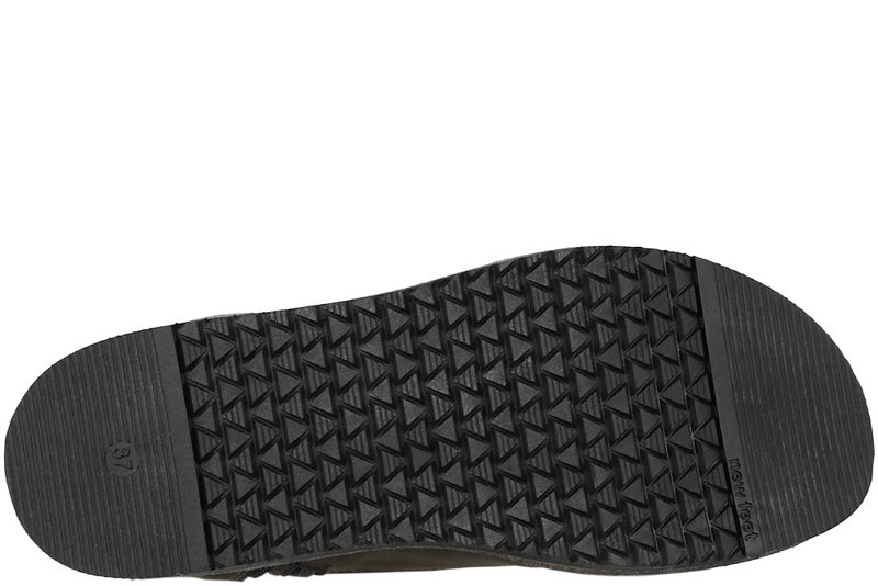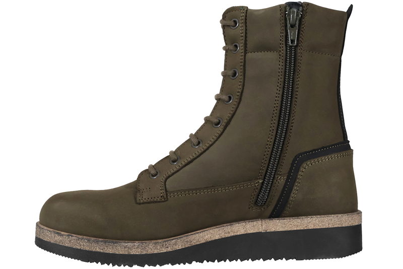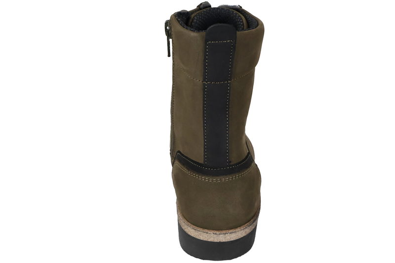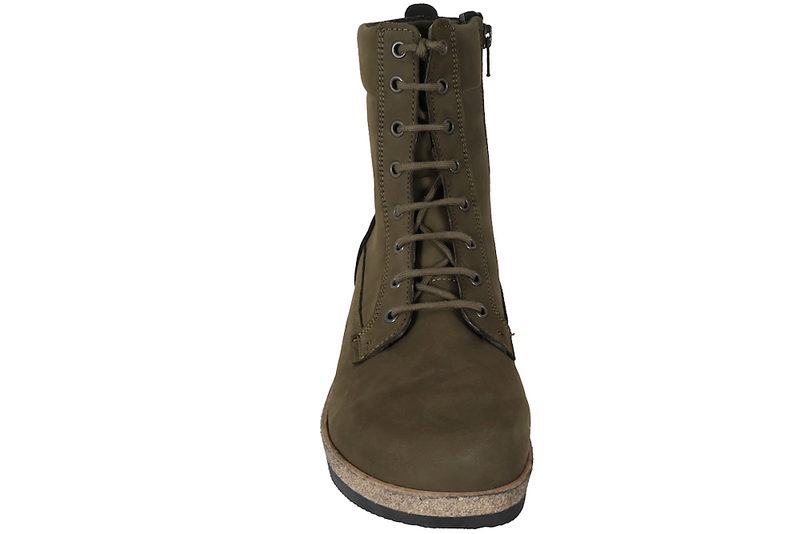 Super smart støvle fra New Feet til dame. Støvlen er lavet af grønt nubuck. Op langs støvlen er der grønne snørebånd, så støvlen kan tilpasses efter foden. På indersiden af støvlen er der en lynlås, så den nemt kan tages af og på. Indvendigt er støvlen foret med sort tekstil. Indlægssålen er New Feets kendte 6 mm. som er behagelig og stødabsorberende. Mellemsålen har en kork detalje hele vejen rundt. Slidsålen er lavet af sort gummi. En super smart støvle til dame.