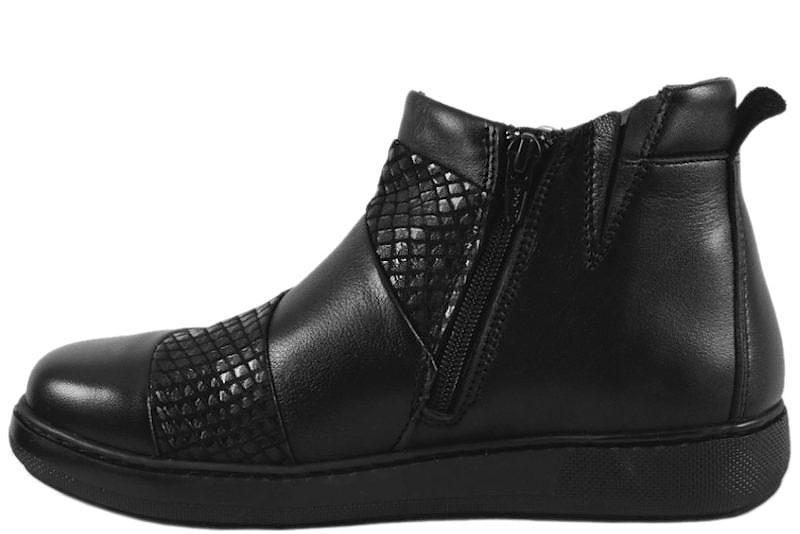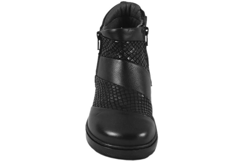 Støvlen er lavet i sort glat skind med en smart slangeskindsprægning. På yder- og indersiden af støvlen er der en sort lynlås, så den er let at komme i og af. Dæksålerne er de populære 6 mm. såler, som er utrolig bløde og stødabsorberende. Den smarte sko er med hælkappe, som holder foden i den rigtige position. Støvlen har god plads, der gør den meget anvendelig med egen specialfremstillet indlægssål. Skoen er specielt egnet til vanskelige fødder, såsom gigt og diabetes fødder.