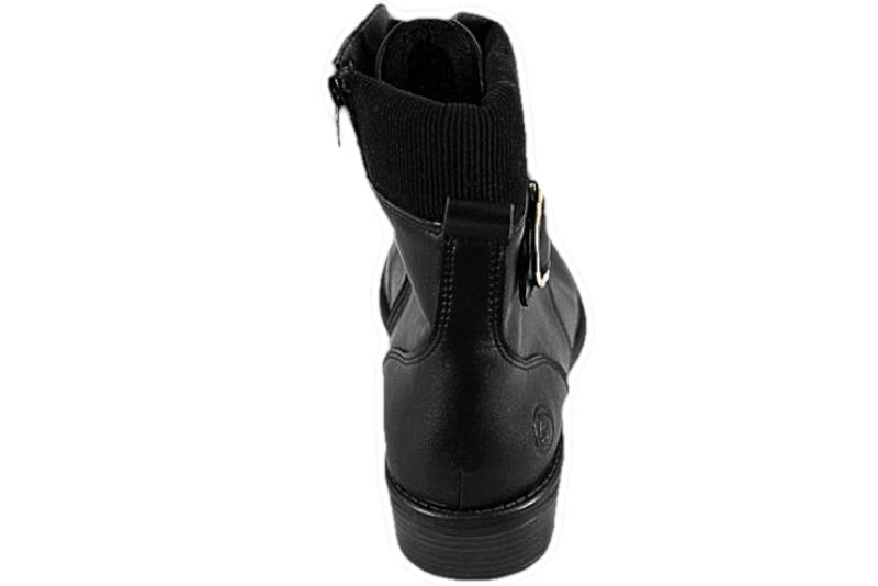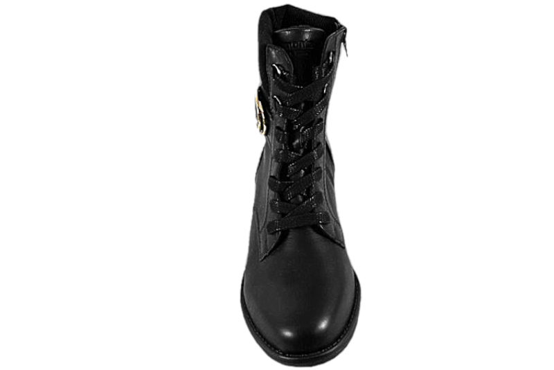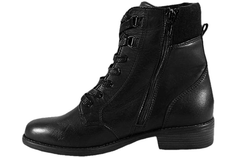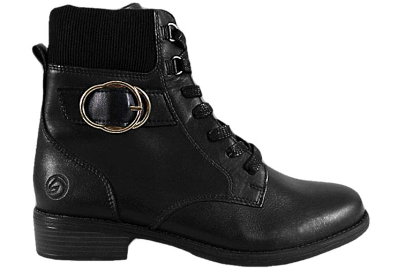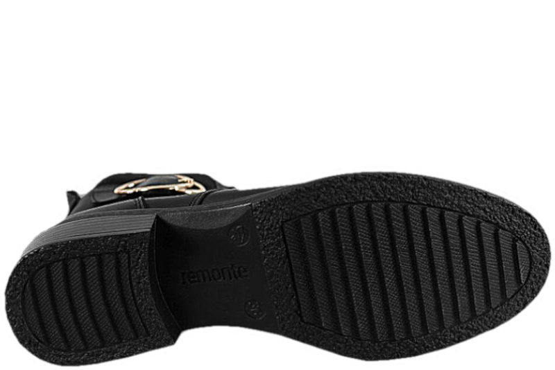 Super flot støvle fra Remonte. Støvlen er lavet i sort glat skind. Op langs vristen har støvlen sort snørebånd, som gør det let at tilpasse støvlen efter foden. På indersiden af skoen er der en lynlås, som gør det let at komme i og af. På ydersiden af støvlen er der en lille rem med en fin guld detalje. Indvendigt er støvlen let foret med sort plys, som gør den dejlig varm. Støvlen har en sort tekstil indlægssål, med svangstøtte samt forfodsstøtte. Slidsålen er lavet i sort PVC. Super fin støvle til damer.