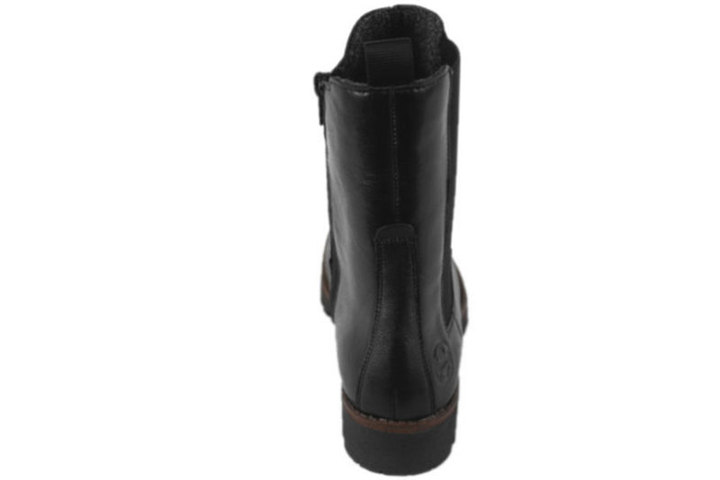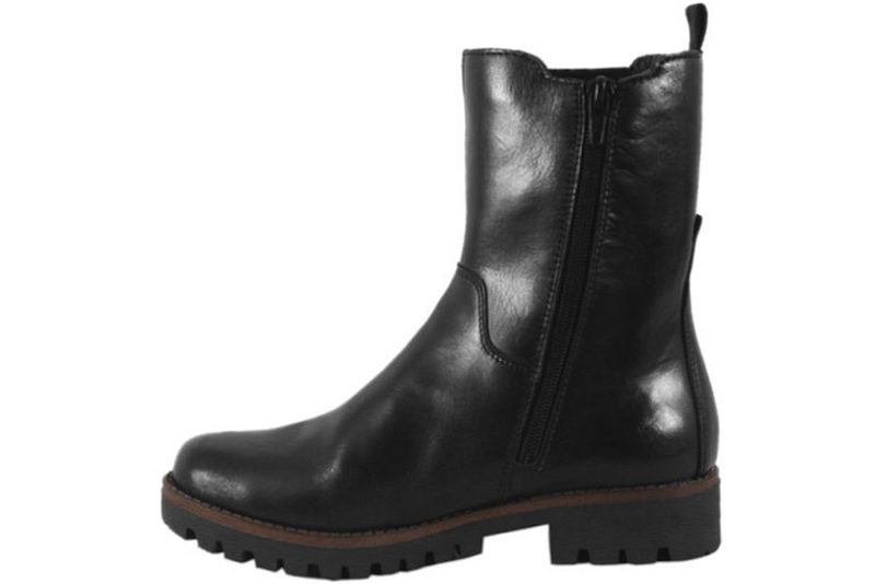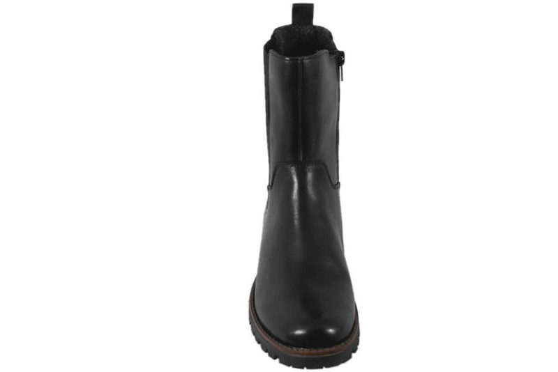 Super smart støvle med tre kvart længde skaft. Støvlen er lavet i sort glat skind. Der er elastik på ydersiden og lynlås på indersiden, så den er let at komme i og af. Der er en tekstil strop bagpå. Indvendigt er den let foret med fleece. Rundt ved sålen er der en mørkebrun rand, som giver en lille detalje. Slidsålen er en sort grov gummisål. Virkelig fin støvle som kan bruges til både hverdag og festlige lejligheder.