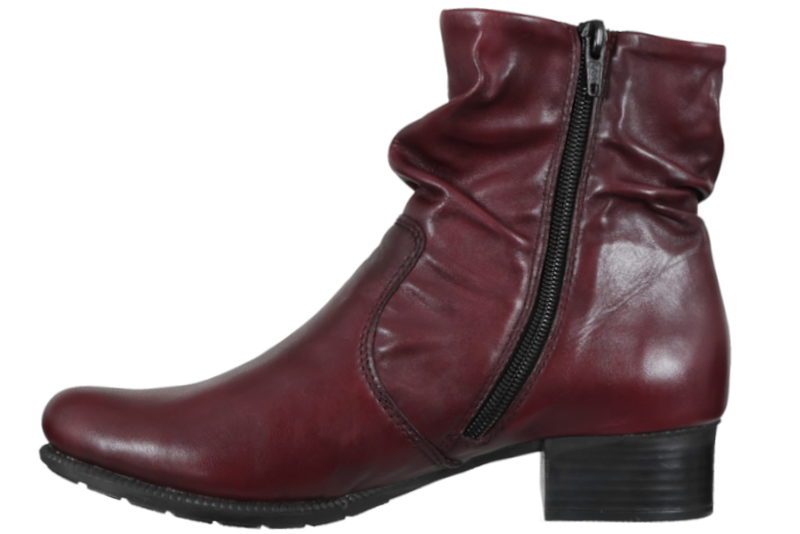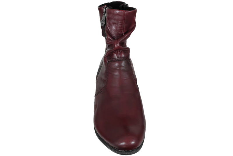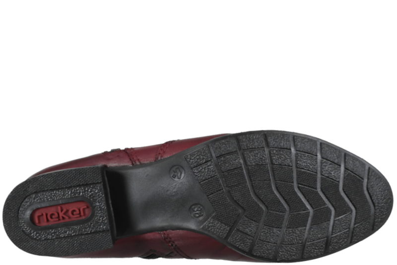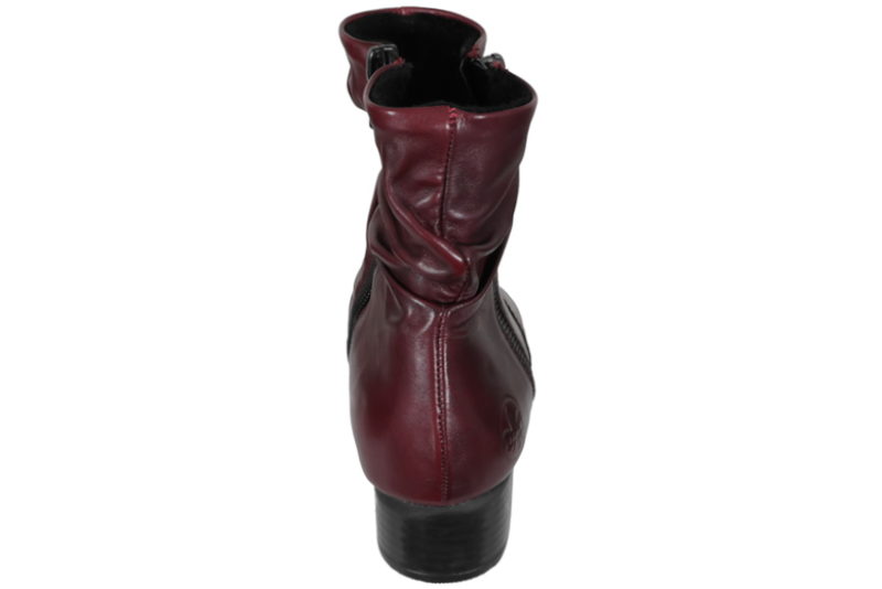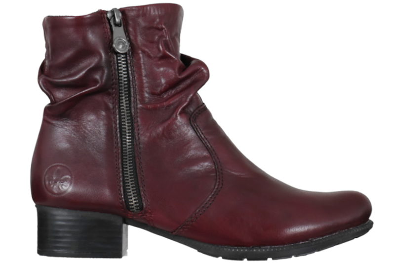 Super smart støvle fra Rieker til dame. Støvlen er lavet af bordeaux glatskind. På begge sider af støvlen er der en lynlås, så støvlen er let at komme af og i. Indvendigt er støvlen let foret med sort fleece. Dæksålen er lavet af sort filt. Denne model har en hæl på 3,5cm. Slidsålen er lavet af sort gummi. En super smart støvle til dame.