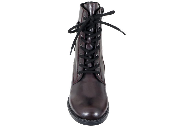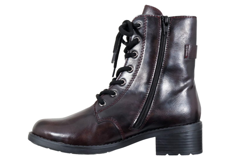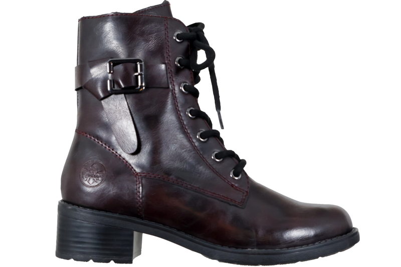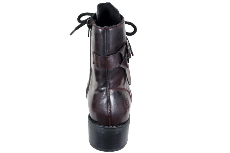 Smart støvle fra Rieker til dame. Støvlen er lavet af mørkerød PU. Foran er der sorte snørebånd, samt lynlås på indersiden, der gør den nem og komme i og af. På ydersiden ved skaftet er der en rem med en sølv pyntespænde, der giver en smart detalje. Indvendig er den let foret med sort fleece foer. Indlægssålen er den velkendte antistress sål, der er dejlig behagelig og træde på. Slidsålen er lavet af sort gummi, så man står godt fast. Hælen måler ca 3 cm.