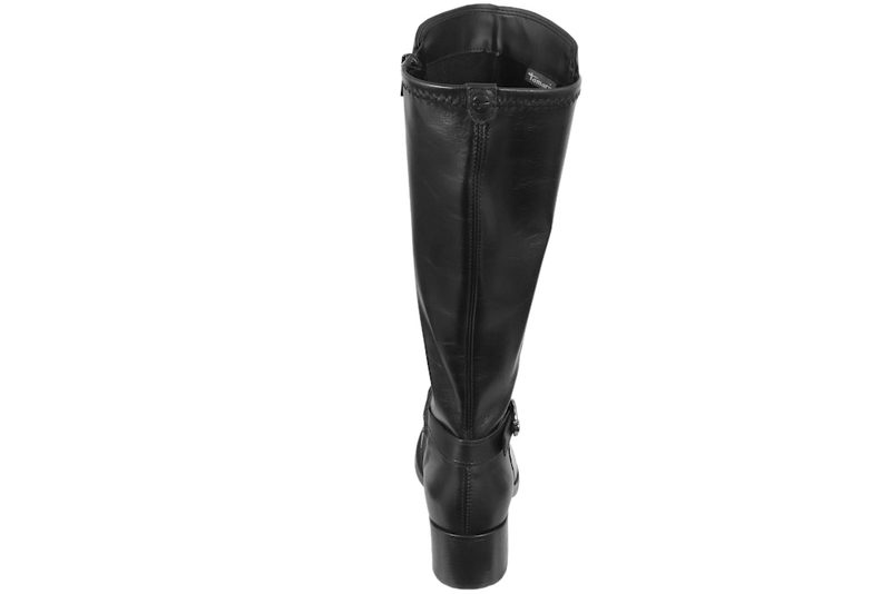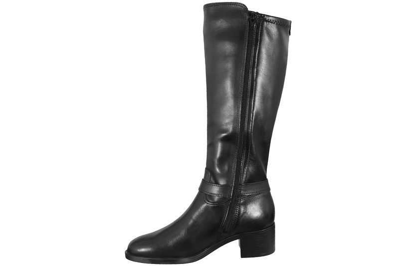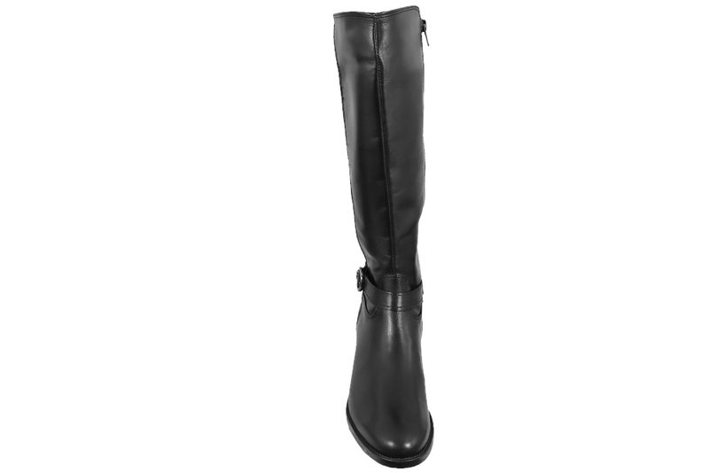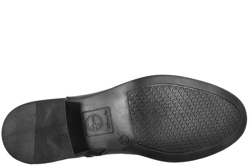 Fin lang støvle fra Tamaris til dame. Støvlen er lavet af sort glat skind, samt PU. Der er en rem rundt omkring støvlen, med et pyntespænde på ydersiden, der giver en smart detalje. På indersiden er der lynlås, så den er nem og komme i og af. Indvendigt er den foret med sort tekstil. Dæksålen er den velkendte Touch It sål i læder, der er behagelig at træde på. Slidsålen er lavet af sort gummi og har en hælhøjde på ca 4,5 cm. Skaftet måler 27 cm.
