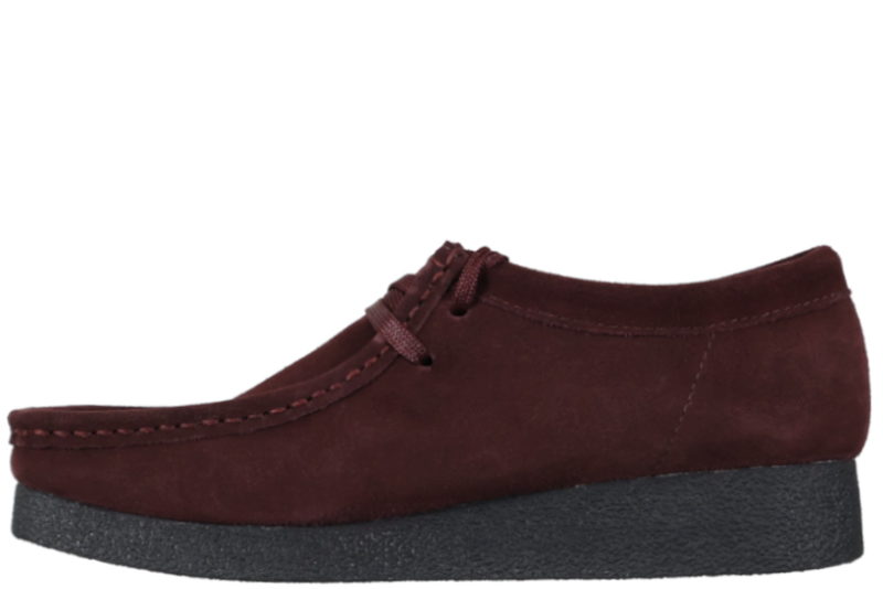 Wallabee i farven "Merlot Suede" fra Clarks Originals. Sålen er den klassiske gummisål i sort, der er cirka 3 cm. høj bagtil. Skoene har en moccasin syning rundt om forbladet og bindes med snørebånd. Indvendigt er skoene foret med lækre skind materialer. Super fed sko fra Clarks til damer.