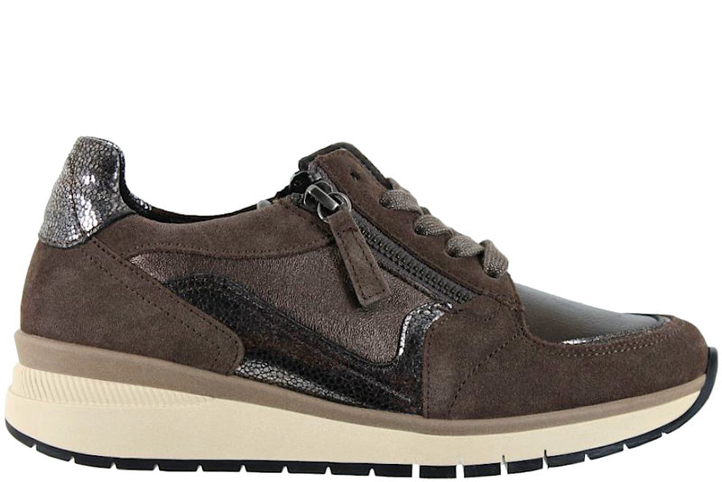 Super smart sko fra Gabor. Skoen er lavet af brunt ruskind og skind i bronze farver. Foran er der brune snørebånd med sølvglimmer, så den kan tilpasses efter foden. På yder- og indersiden er der en lynlås, så den er let at komme i og af. Indvendigt er den foret med sort skind og har en blød indlægsål. Mellemsålen er en beige gummisål. Slidsålen er en sort gummisål, som er slidstærk. Rigtig flot sko, der kan bruges til mange outfits.