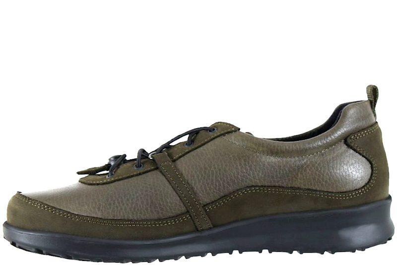 Olivengrøn sko med grå elastiksnøre fra New Feet. Skoene er lavet i grønt glat skind med detaljer i nubuck, hvilket giver et super flot look. Skoene har ingen indvendige syninger. Man træder på en stødabsorberende sål, hvilket er fantastisk at gå på. De anbefales til gigt og sår patienter. Indlægssålen er udtagelig. Slidsålen er lavet af sort slidstærkt gummi. Super god sko med kvaliteten i top.