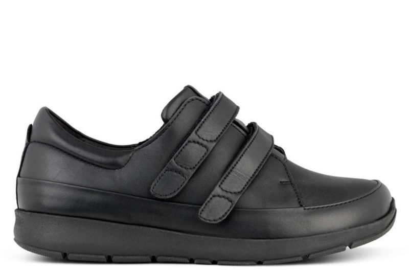 NEW FEET. Sort sko fra New Feet til damer i glat skind og med strecht over forfoden. Skoen har to velcroremme over vristen, hvilket gør den nem at komme i og af. Lækker blød gummisål, og 6 mm støddæmpende indersål. Fast hælkap der holder foden i den rigtige position. God plads, der gør den meget anvendelig med egen specialfremstillet indlægssål. Skoen er specielt egnede til vanskelige fødder såsom gigt og diabetes fødder.