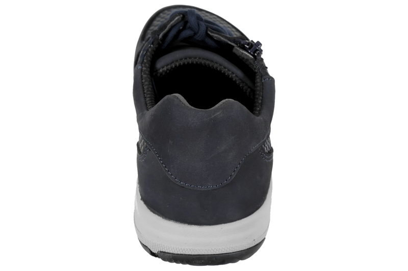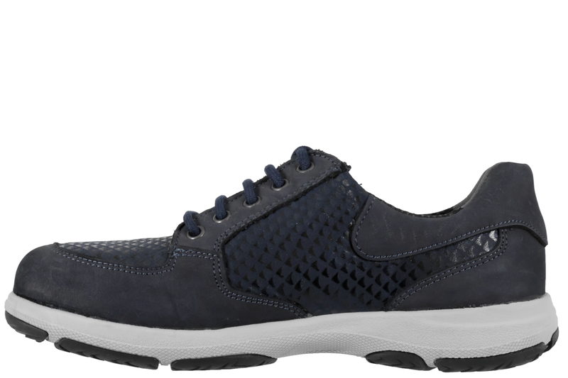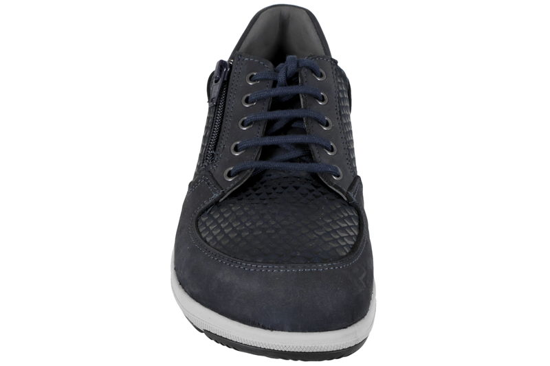 Blå skindsko med præget look til damer. Skoen er lavet i blå nubuck stretch skind. Der er lynlås på ydersiden, så den er let at komme i og af. Skoen har blå snørebånd. Slidsålerne er i grå gummi. Indvendigt er der en 6 mm. støddæmpende indlægssål, der er udtagelig. Skoen er særligt god til gigt og diabetes fødder, samt alle andre der vil være rare ved deres fødder. Slidsålen er af sort gummi.