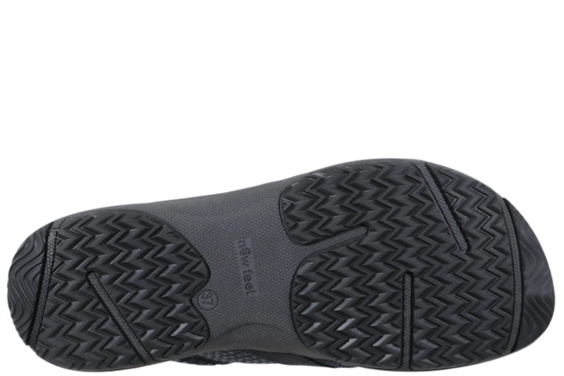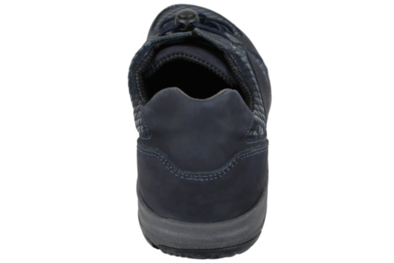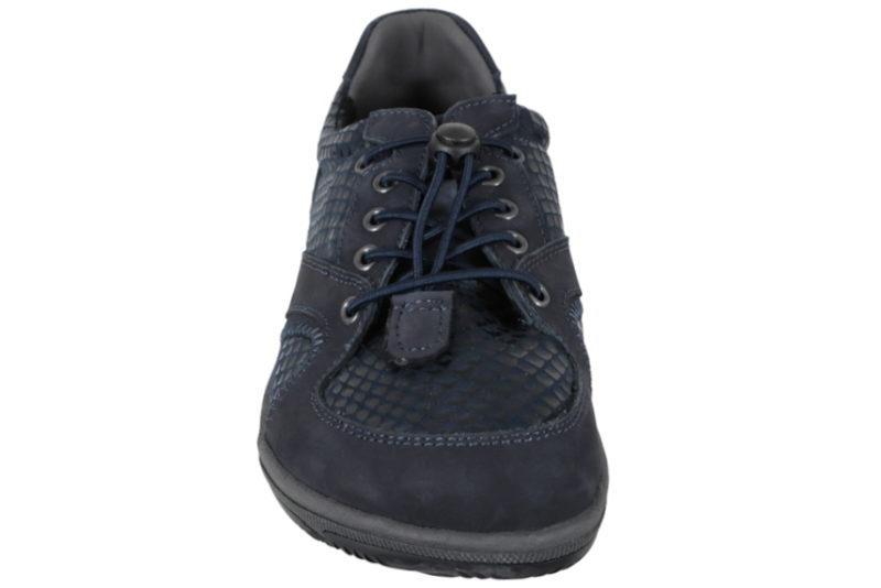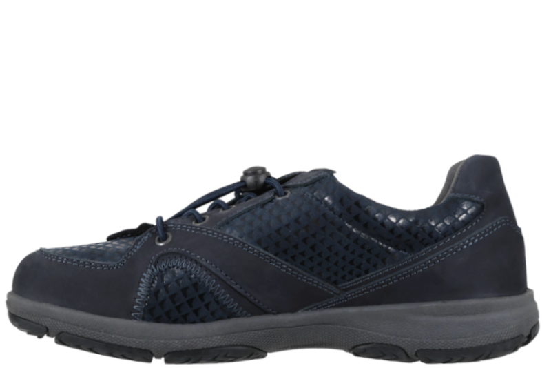 Super god sko fra New Feet til damer. Skoen er lavet af blå præget nubuk. På forbladet er det stretch materiale. Foran er der blå elastik snørebånd, så den er let at komme i og af. Indvendigt er den foret med gråt og blåt tekstil og har en 6 mm. indlægssål som skåner knæ og ryg. New Feet er egnet til folk med gigt og sukkersyge. Der er ingen indvendige syninger. Slidsålen er en grå og sort gummisål, så man står fast. Modellen er med Tex så fødderne holdes tørre.