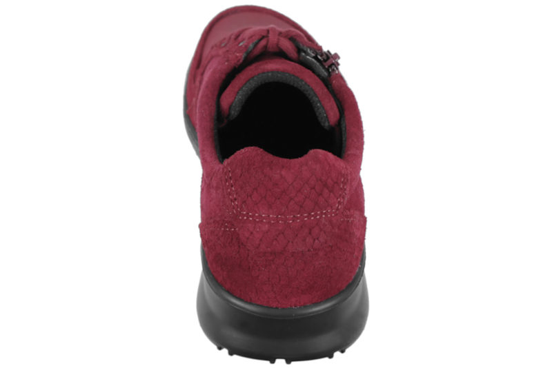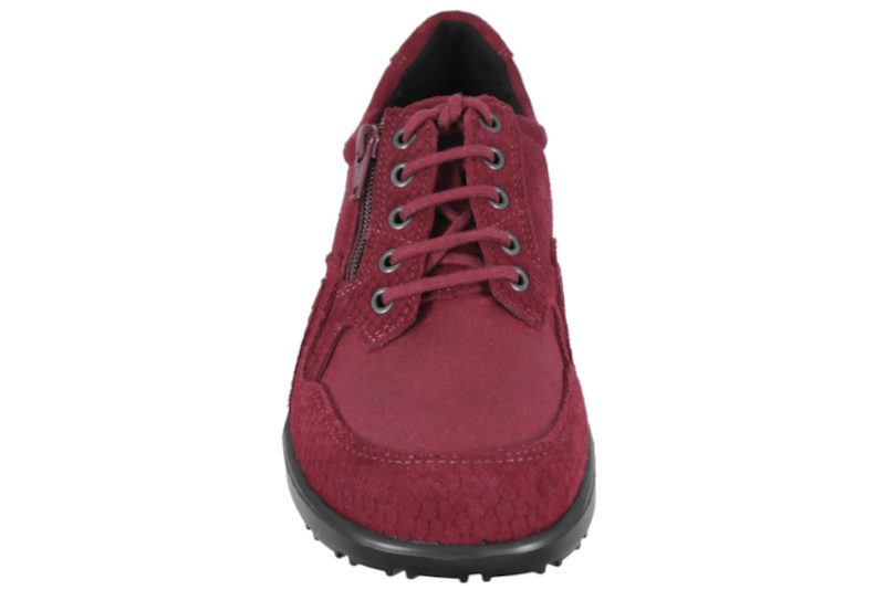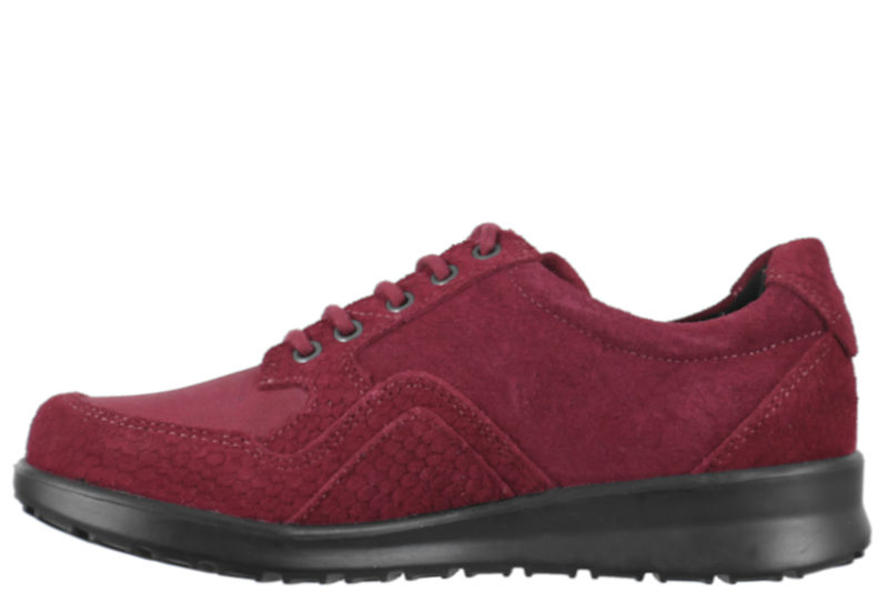 Disse flotte sko fra New Feet er lavet i en flot rød præget ruskind. Over vristen er der matchende snørebånd, så den let kan tilpasses til foden. På ydersiden er der en lynlås, så den er let at komme i og af. Sålen er 6 mm. og er støddæmpende. Slidsålen er en sål i sort, som er 3,5 cm. Slidsålen er utrolig slidstærk. Skoen har en fast hælkappe, som holder foden i den rigtige position. Skoen er specielt velegnet til vanskelige fødder, såsom gigt og diabetes fødder.