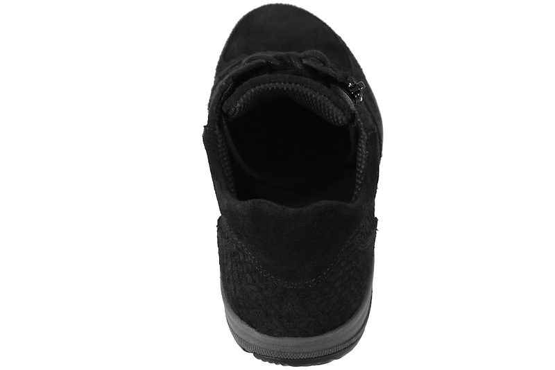 Sort sko i præget ruskind med ruskind på forbladet fra New Feet. Den har lynlås på ydersiden og snørebånd foran. Den er med en tex membram, som gør den vandafvisende. Den har en indlægssål med 6 mm. stødabsorbering. Den er velegnet til gigt fødder og andre former for problemer med fødderne. Den har en god bredde samt har den en meget stabil hælkappe.