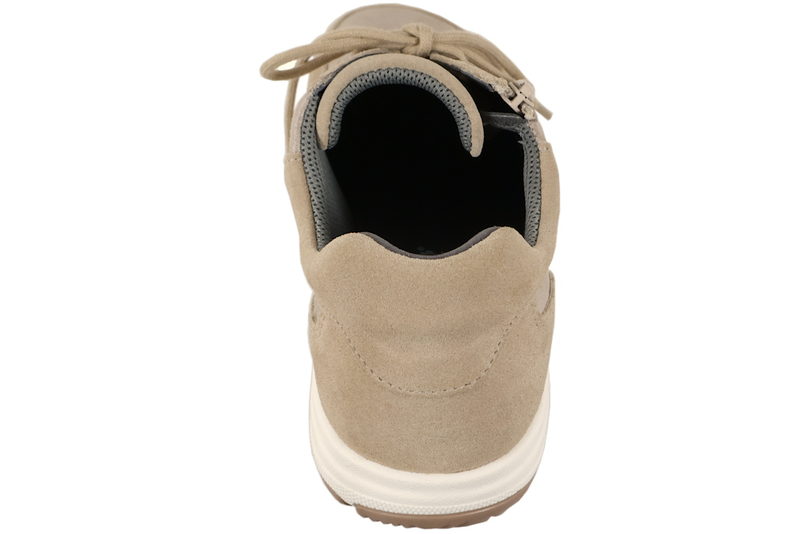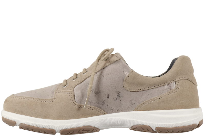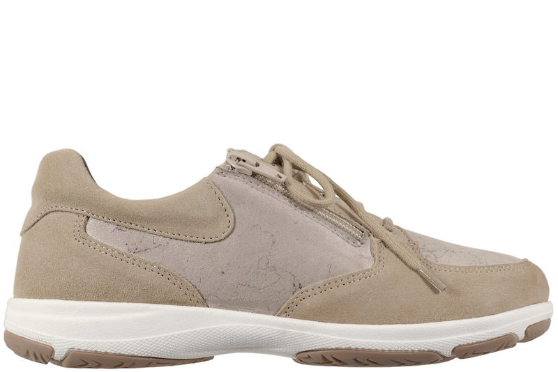 Super smart sko fra New Feet til dame. Skoen er lavet af sandfarvet ruskind. Skoen er deltajeret med auto-stretch med marmor-effekt. Skoen har sandfarvede snørebånd, samt en lynlås på indersiden, så skoen er let at komme i og få af. Indvendigt er skoen foret med tekstil. Indlægssålen er New Feets kendte 6 mm. sål. Denne model er god til gigt og diabetiker, da der ingen indvendige syninger, der kan genere. Mellemsålen er lavet af hvidt gummi, og slidsålen er lavet af brunt gummi. En super smart sko der kan bruges til lidt af hvert.