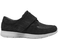Smart sko fra New Feet. Skoen er lavet i sort nubuck med velcrorem og stretch over forfoden. Læderet er slangeskindspræget, hvilket giver skoen en smart detalje. Skoen har en lækker blød gummisål, med en 6 mm. støddæmpende indlægssål. Skoen har en fast hælkappe der holder foden i den rigtige position. Skoen er specielt egnede til vanskelige fødder såsom gigt og diabetes fødder.