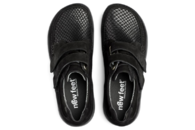 Super god sko fra New Feet til damer. Skoen er lavet af præget nubuck i sort. Skoen er med to velcroremme henover forfoden, så den er let at komme i og af. Indvendigt er den foret med grå tekstil. Der ligger en 6 mm. blød indlægssål, som er stødabsorberende og skåner knæ og ryg. Der er ingen indvendige syninger. New Feet er velegnet til gigt patienter og diabetiker. Denne model er med fast hælkappe, som giver den optimale støtte.