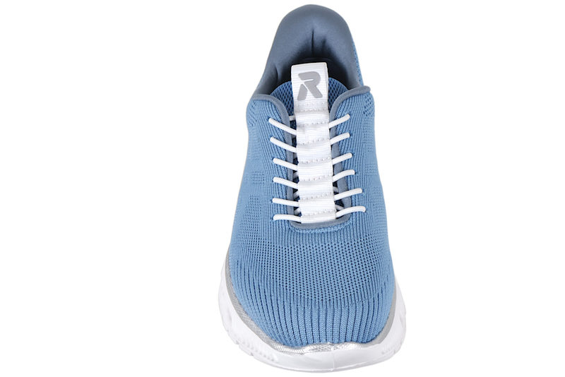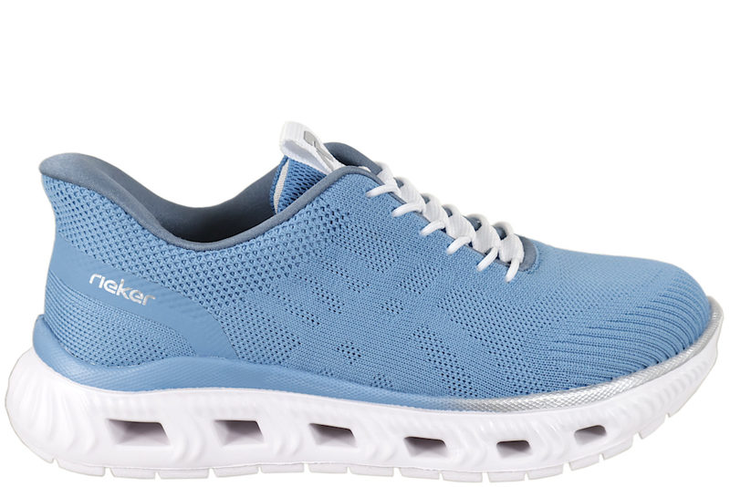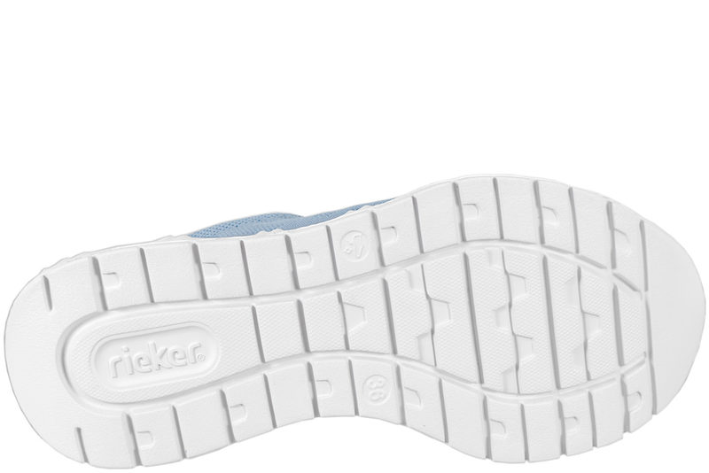 Smart sko fra Rieker til dame. Skoen er lavet i lyseblå tekstil, og har hvide elastik snørebånd, samt ReadyToGo hælkappe, der gør den nem at komme i og af. Indvendig er den foret med tekstil og har en blød Rieker Soft sål, der former sig efter foden. Mellemsålen er lavet af EVA skum med lufthuller, der giver en god støbabsobering. Slidsålen er lavet af hvid gummi, så man står godt fast. En lækker sko der kan bruges til meget.