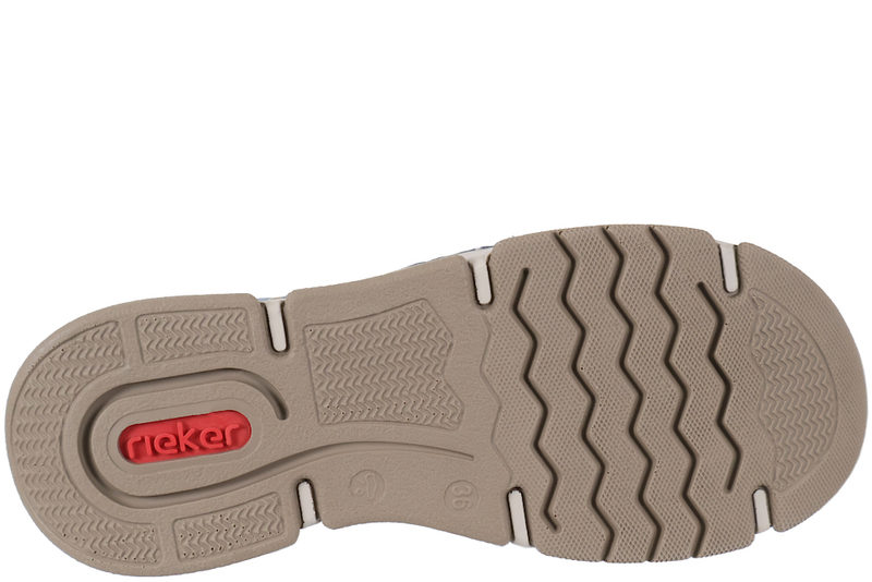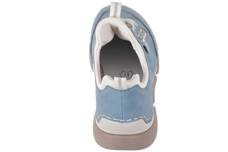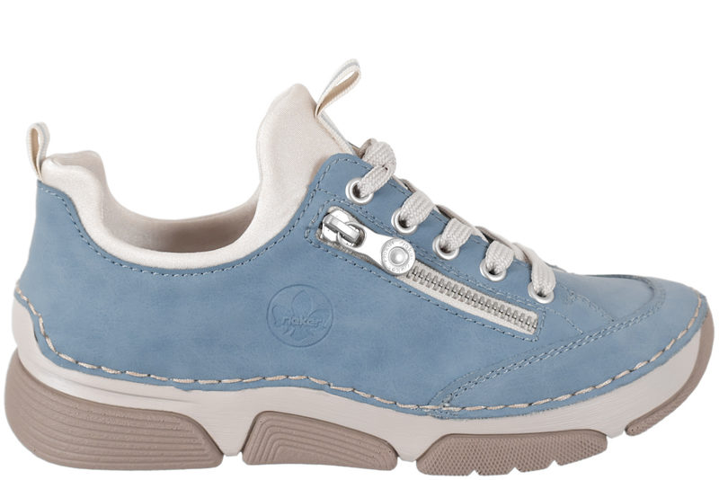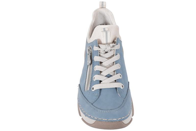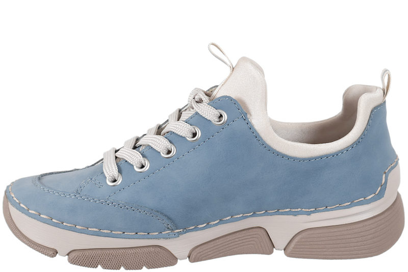 Super smart lyseblå sko fra Rieker til dame. Skoen er lavet af lyseblå PU og beige tekstil. Op langst vristen er der beige snørrebånd, så skoen kan tilpasses efter foden. På ydersiden er skoen detaljeret med en pyntelynlås. Indvendigt er skoen foret med beige tekstil. Dæksålen er af beige læder. Mellem sålen er beige PVC og slidsålen er af lysebrunt gummi. Super smart sko til dame.