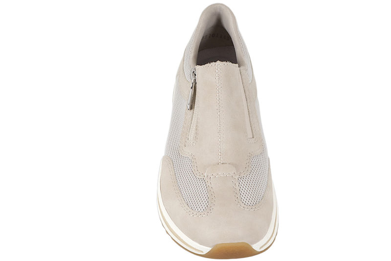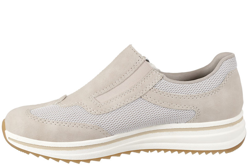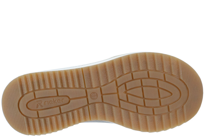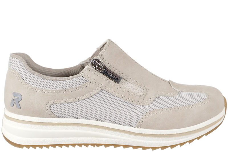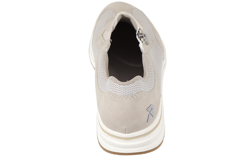 Super smart sko fra Rieker til dame. Skoen er lavet i beige PU og tekstil. På ydersiden er der en lynlås, og på indersiden er der elastik så skoen er let at komme i. Indvendigt er skoen foret med beige tekstil. Indlægssålen er i beige tekstil. Denne model er med ekstra vidde. Mellemsålen er lavet af hvidt PVC og slidsålen er lavet af en naturfarvet gummi. En super smart sko til dame.