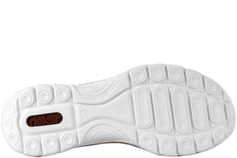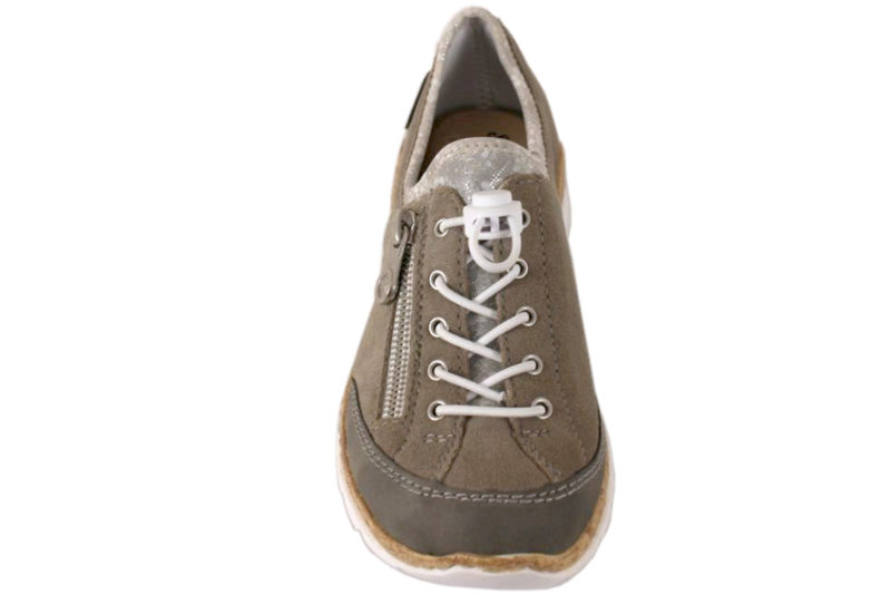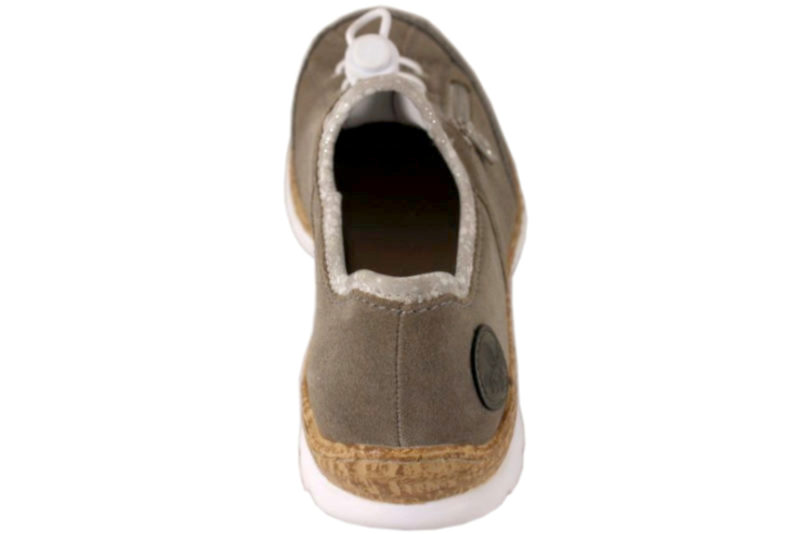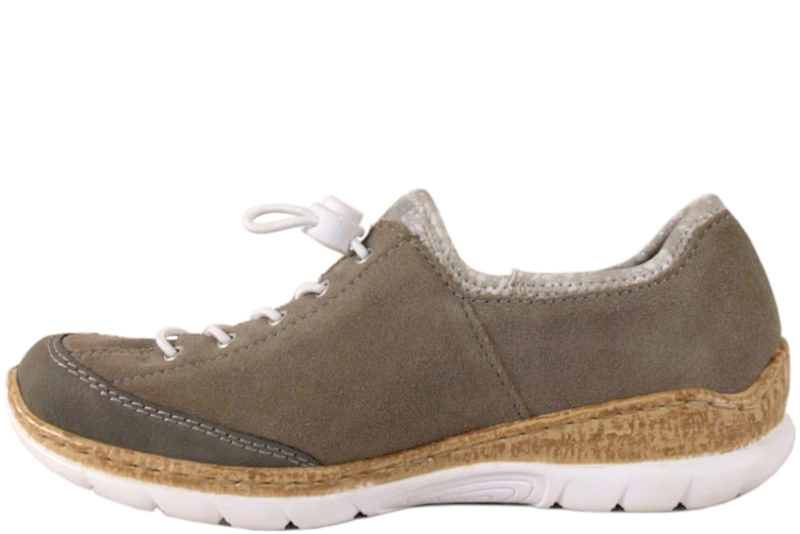 God travesko fra Rieker. Skoen er lavet i gråt ruskind og lys tekstil. Foran er der hvide elastik let luk snørebånd, så den er let at komme i og af. På ydresiden er der en pyntelynlås. Indvendigt er den foret med hvidt tekstil og har en MomoSoft dæksål, der er blød at træde på. Slidsålen er en hvid gummisål med stødabsorbering. God sko der kan bruges til mange anledninger.