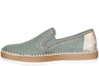 Super smart, luftig og let sko fra Rieker til dame. Skoen er lavet i grønt tekstil. Bagpå hælkappen er der et guldfarvet logo i skind. Indvendigt er skoen foret med tekstil, og dæksålen er i lyst skind. Dæksålen er den velkendte sål "Antistress" fra Rieker. Mellemsålen er i naturfarvet flet-look, med hvide syninger. Slidsålen er lavet i hvidt PU.