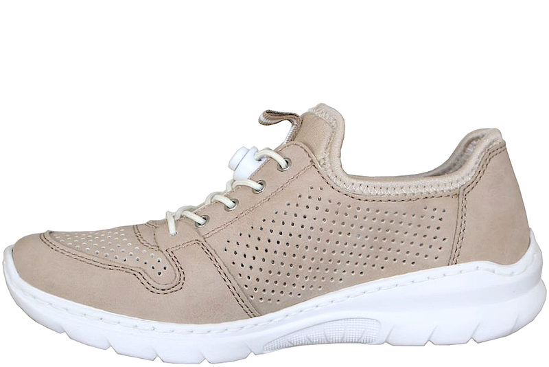 God travesko fra Rieker. Skoen er lavet i beige mesh. Skoen har hvide snørebånd med letluk, så den er let at komme i og af. Indvendigt er den foret med hvidt tekstil, og den har en blød antistress sål, som er behagelig at gå på. Skoen er med en hvid mellemsål. Slidsålen er en hvid slidstærk gummisål. God travesko til damer.