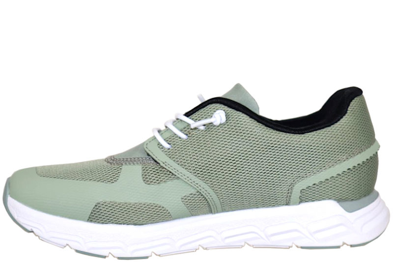 Smart sko fra Rieker til dame. Skoen er lavet af grønt tekstil samt PU. Foran er der hvide elastik snørebånd, som kan udskiftes med hvide bomulds snørebånd der medfølger. På ydersiden er der et stort "R" med refleks for Rieker. Indvendigt er den foret med sort tekstil. Indlægssålen er en Soft sål med svangstøtte. Slidsålen er hvid og grøn.