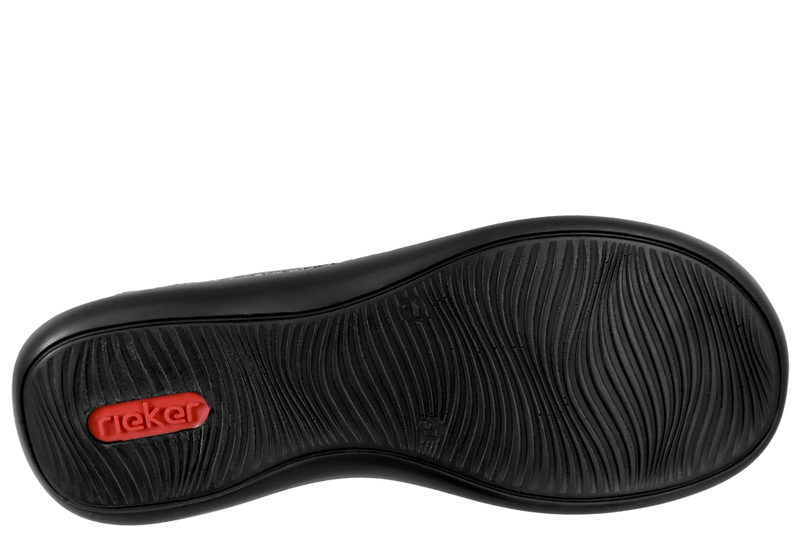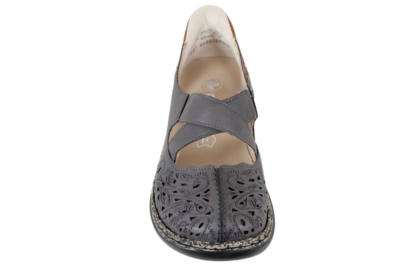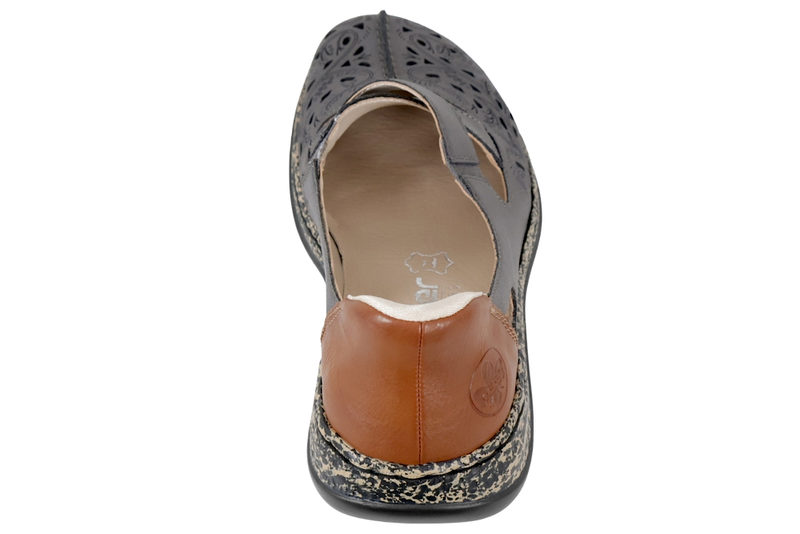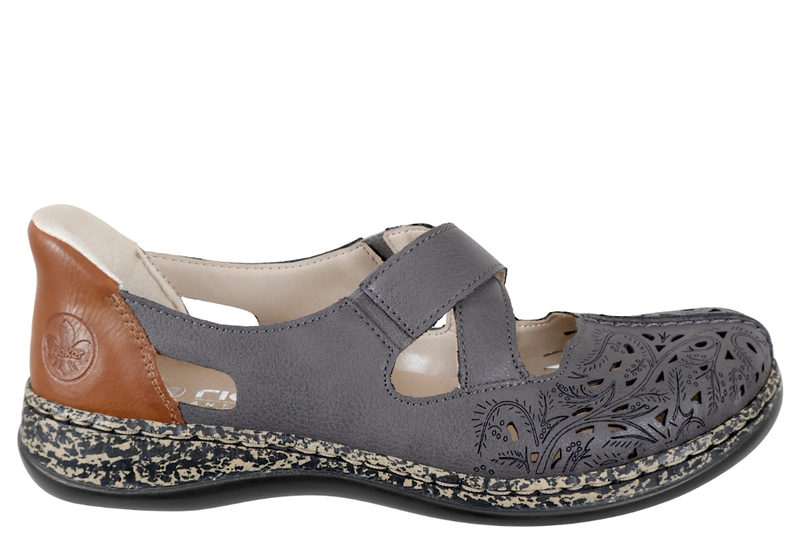 Let og åben damesko med krydsrem over vristen med elastik. Overdelen er lavet i mørkt gråt glat skind, pg en brun hælkappe af glat skind. På forbladet er der et blomstermønster med huller i skindet. Dæksålerne er i beige skind og er bløde. Mellemsålen er lavet i PU med kork look. Slidsålen er lavet i sort gummi. Denne model er med Ready2Go, som gør at man hurtigt kan smutte i skoen. Smart sko fra Rieker til damer.