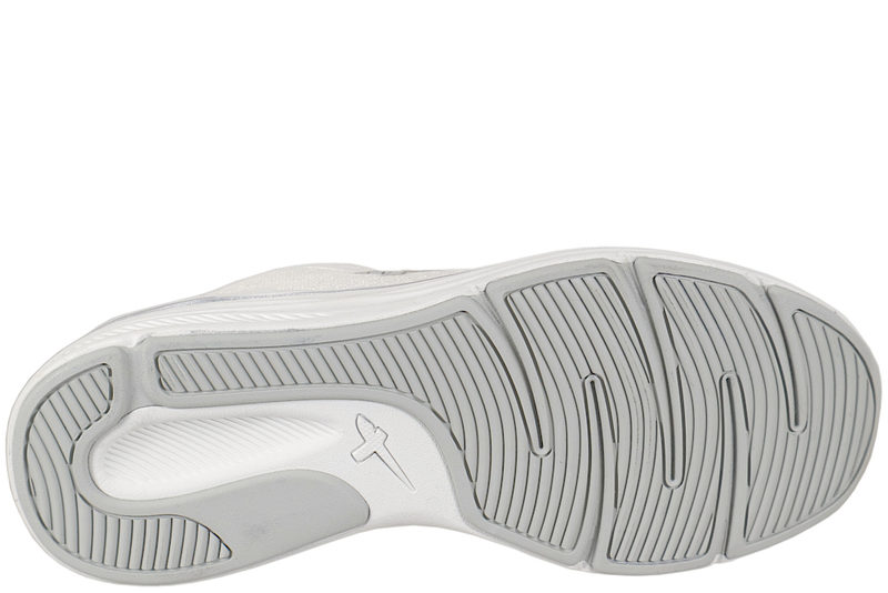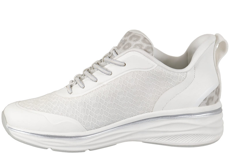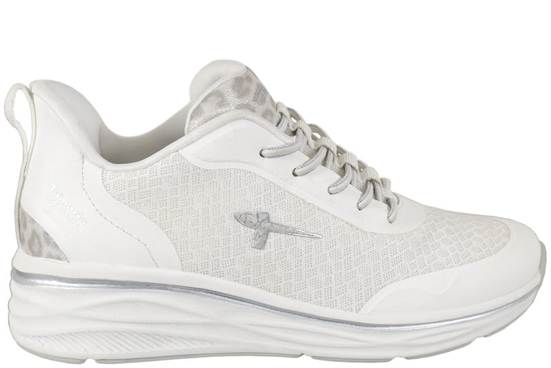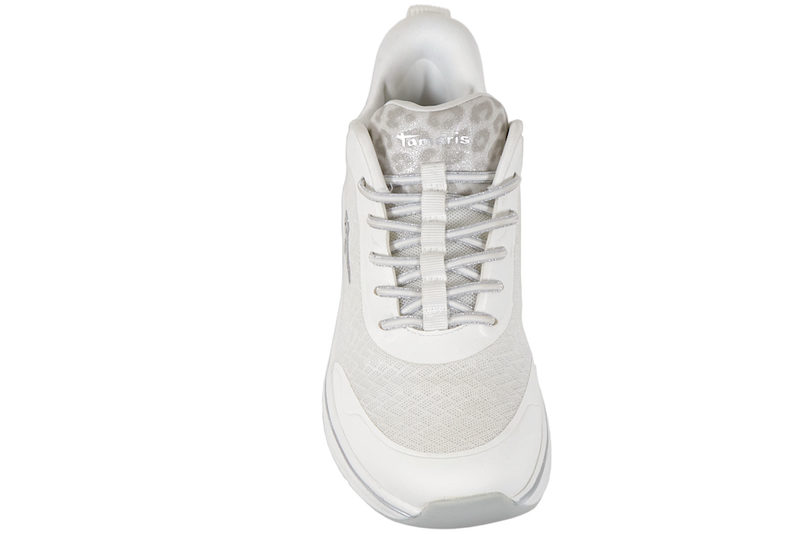 Smart sko fra Tamaris til dame. Skoen er lavet af hvid og sølv PU samt mesh. Foran er der elastik snørebånd, samt step-in i hælkappen, der gør den nem og komme i og af uden brug af skohorn. På pløsen er der leopard print, der giver en smart detalje. Indvendig er den foret med hvid tekstil og har en Ortholite indlægssål, hvilket gør den åndbar. Slidsålen er lavet af grå gummi, så man står godt fast.