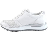 Super god sko fra Waldläufer til damer. Skoen er lavet af hvidt PU og tekstil. Foran er der hvide snørebånd, så den kan tilpasses efter foden. På ydersiden er der en lynlås, så den er let at komme i og af. Foran er der blomsterprint i sølv, som giver et smart look. Indvendigt er den foret med hvidt tekstil og har en indlægssål i tekstil. Mellemsålen er lavet af hvidt EVA. Slidsålen er lavet af gråt gummi. Skoen er med vidde H.