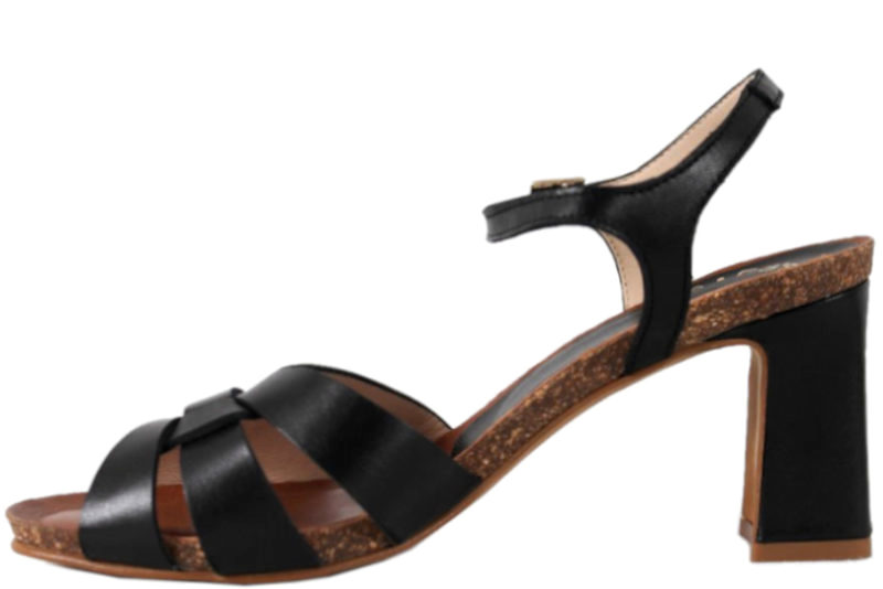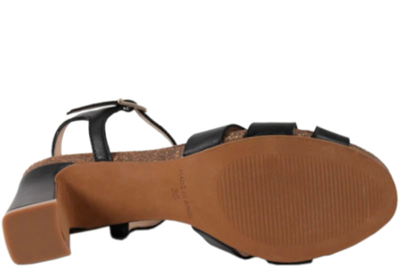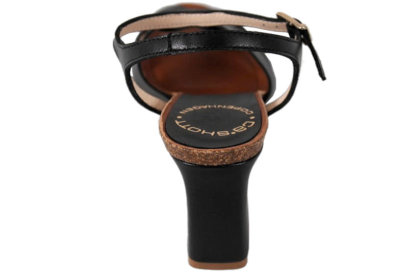 Super smart sandal med hæl fra Cashott. Sandalen er lavet af sort glat skind. Foran er der nogle remme, som danner et mønster, som giver et flot look. Sandalen er med en rem omkring anklen, så den kan justeres efter behov. Indvendigt er en foret med glat skind, og har en blød og behagelig dæksål. Slidsålen er en brun gummisål, så man står godt fast. Hælen måler 7 cm.