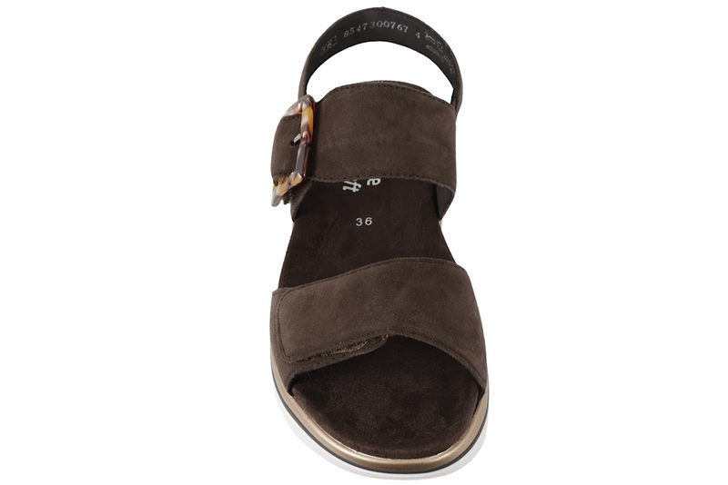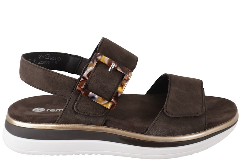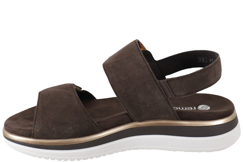 Super fin sandal fra Remonte til dame. Sandalen er lavet af mørkebrunt ruskind, med en velcrom over tærerne og en over forfoden med et flot pyntespænde. Modellen er også med en hælrem. Indvendigt er sandalen foret med mørkebrunt PU. Indlægssålen er i mørkebrunt tekstil, og sidder fast med velcro, hvilket gør det muligt at tage den ud, hvis man har eget indlæg. Mellemsålen er inddelt i tre EVA lag i guld, brun og hvid. Slidsålen er en hvid EVA sål. En super fin sandal der kan bruges til lidt af hvert.