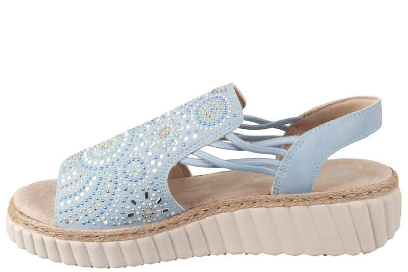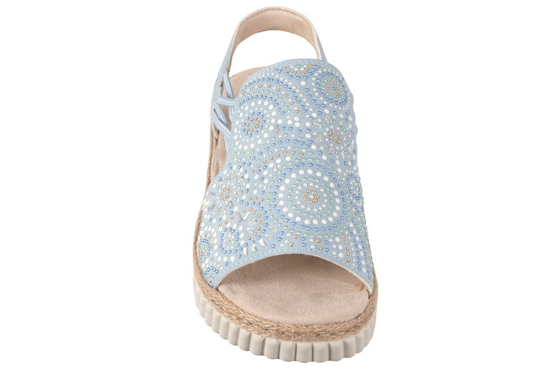 Super fin sandal med kilehæl. Sandalen er lavet af lyseblå PU. Op over vristen er der PU i lyseblå med blå og lyse sten, som giver et smart look. På ydresiderne er der blå elastik, som gør sandalen let at komme i. Sandalen er med hælrem, som den sidder godt på foden. Indvendig er den foret emd lyst PU og har en Antistress dæksål, der er blød og behagelig at træde på. Slidsålen er en begie PVC sål.