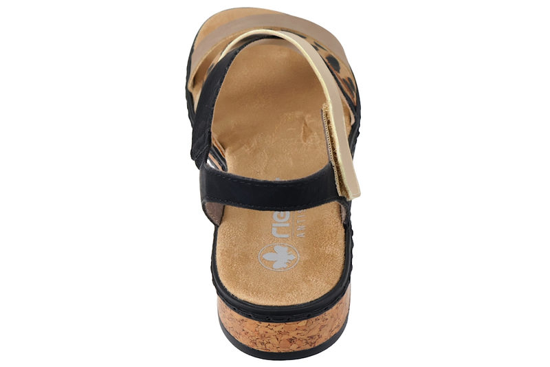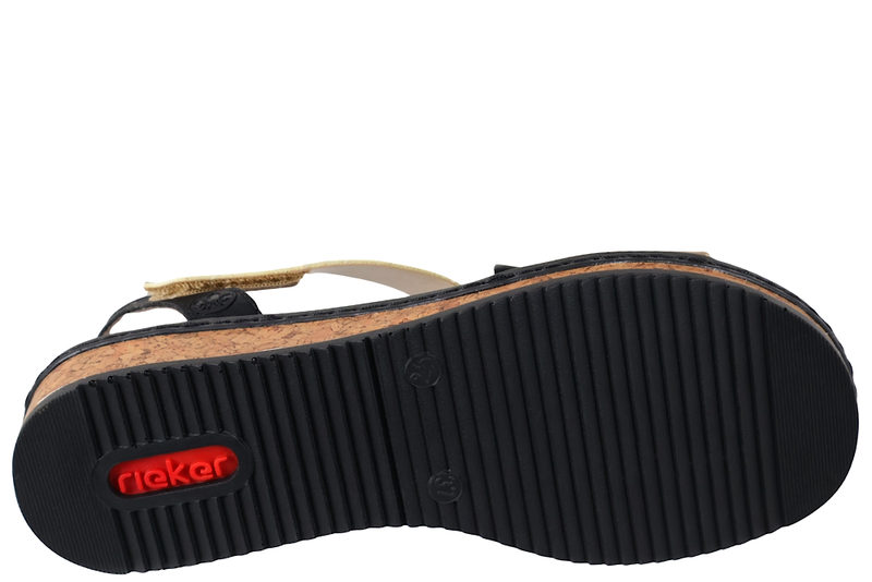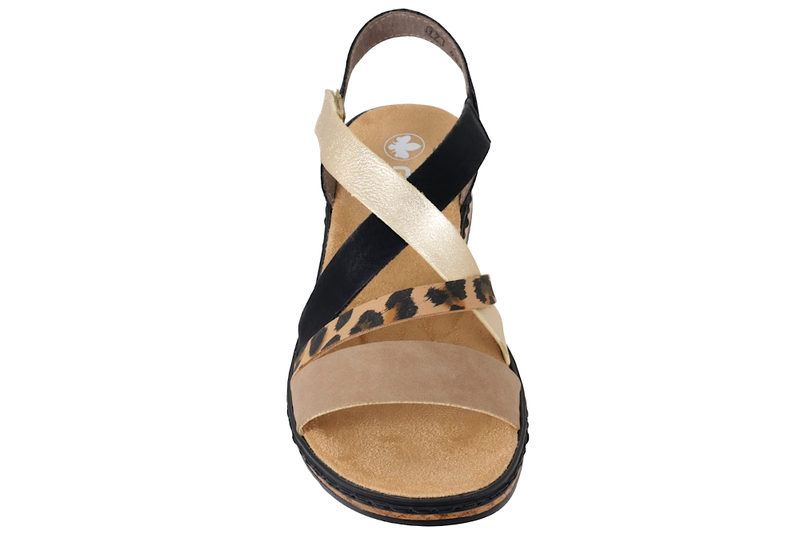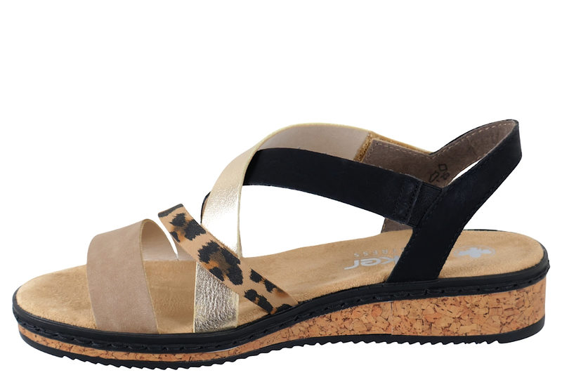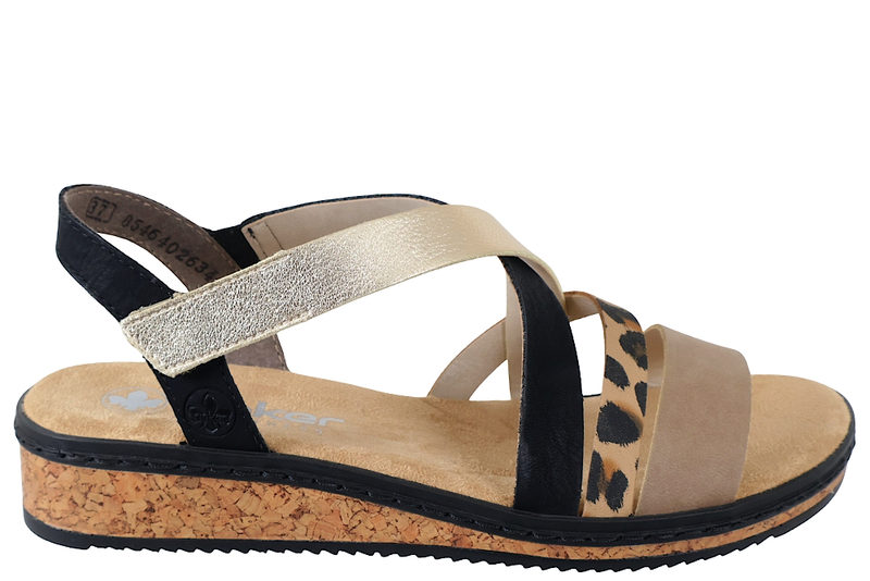 Super flot sandal fra Rieker, til damer. Sandalen er lavet af PU. Sandalen er med tre remme henover forfoden, som krydser hinanden. De er i farverne beige, sort, leopard og guld. Øverst kan den justres med en velcro, så den kan tilpasses efter foden. Indvendig er den foret med lyst PU og har en blød og behagelig dæksål. Mellemsålen er af kork look med kilehæl. Slidsålen er en sort PVC sål