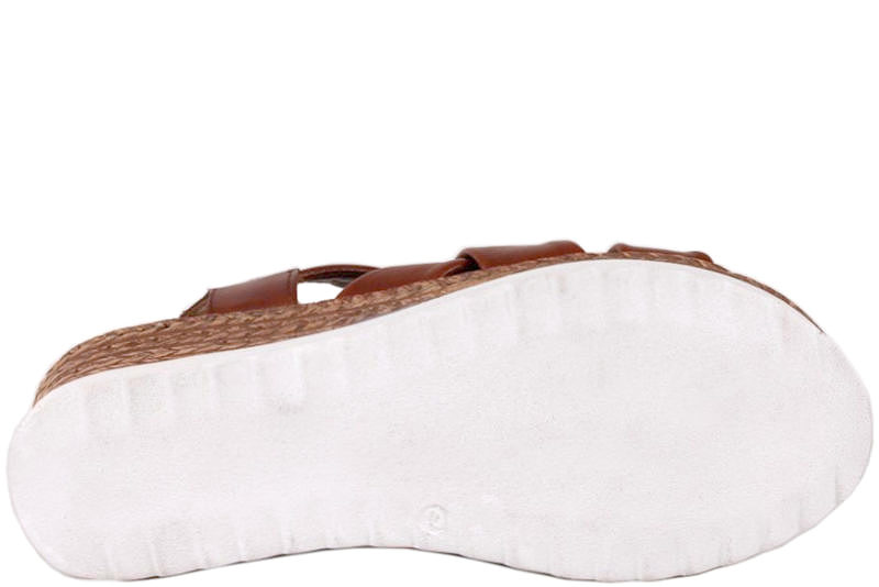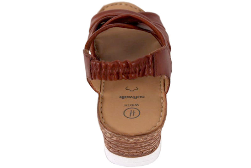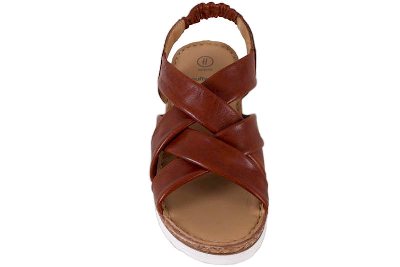 Super smart sandal fra Softwalk. Sandalen er lavet af cognacfarvet glat skind. Henover forfoden er der fire remme der danner to krydser, som giver et flot look. Ved hælen er den en elastikrem, som gør den let at komme i og af. Indvendigt er den foret med glat skind og har en blød og behagelig dæksål. Mellemsålen er af brunt PU. Sandalen er med kilehæl, som giver en flot højde. Slidsålen er en hvid gummisål. Rigtig god sandal med hæl, der kan bruges til mange anledninger og den er handskeblød i skindet.