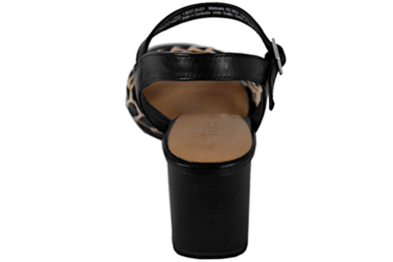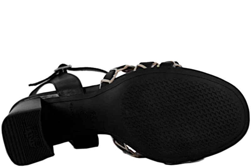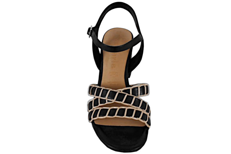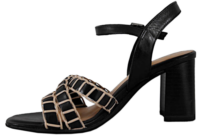 Super smart sandal på hæl fra Tamaris. Sandalen er lavet af sort glat skind. Foran er der tre remme, hvor to af dem krydser hinanden. De tre remme er med beige detaljer, som giver et smart look. Øverst er der en rem, som kan justeres med et sølvfarvet spænde på ydresiden. Indvendigt er den foret med sort PU og har en Touch it dæksål i skind. Slidsålen er en sort gummisål, så man står fast. Hælen måler 6,5 cm. Rigtig flot sandal, der kan bruges til mange anledninger.
