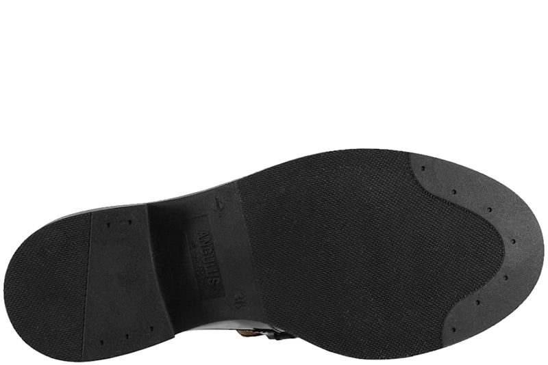 Super smart loafers fra Angulus til damer. Skoen er lavet af sort lak læder. På forbladet er der flet og en rem, som giver et smart look. Indvendigt er den foret med brunt skind og har en dæksål i skind. Slidsålen er en robust sort gummisål, så man står godt fast. Rigtig god loafers med en god pasform.