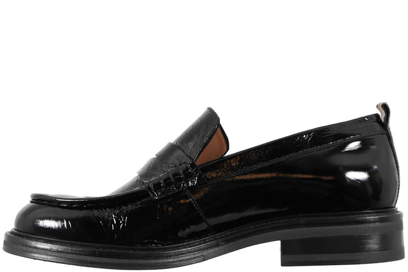 Smart loafers fra Billi Bi til dame. Den er lavet af sort glat skind med lak look. Foran er der en rem, som giver et smart look. Indvendigt er den foret med brunt skind, og den har en dæksål i skind. Slidsålen er en tunitsål. Rigtig smart loafers der kan bruges til mange anledninger.