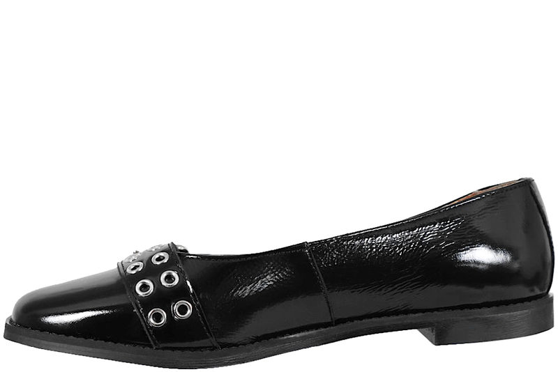 Super smuk loafers fra CaShott. Skoen er lavet i sort lakskind. Ved forfoden er der en rem med et spænde, som giver et smart look. Indvendigt er skoen foret med brunt skind, og den har en dæksål i skind. Slidsålen er lavet af sort gummi. Super smart sko, som kan pifte ethvert outfit op.