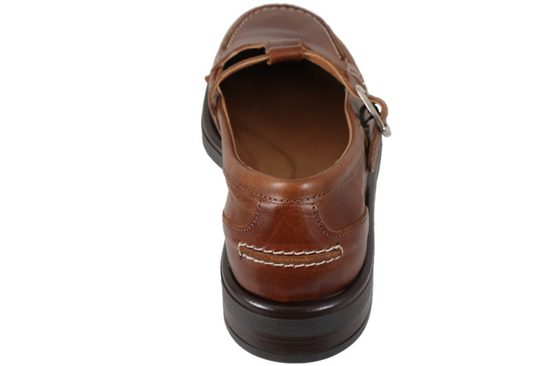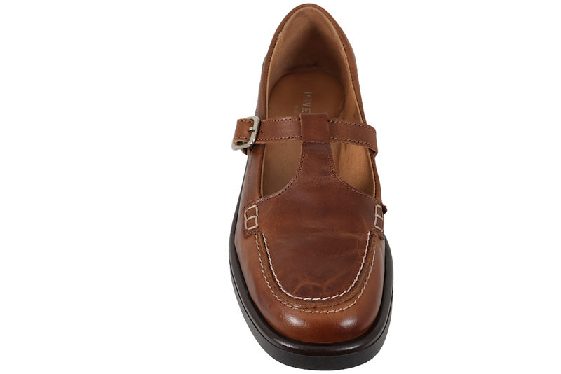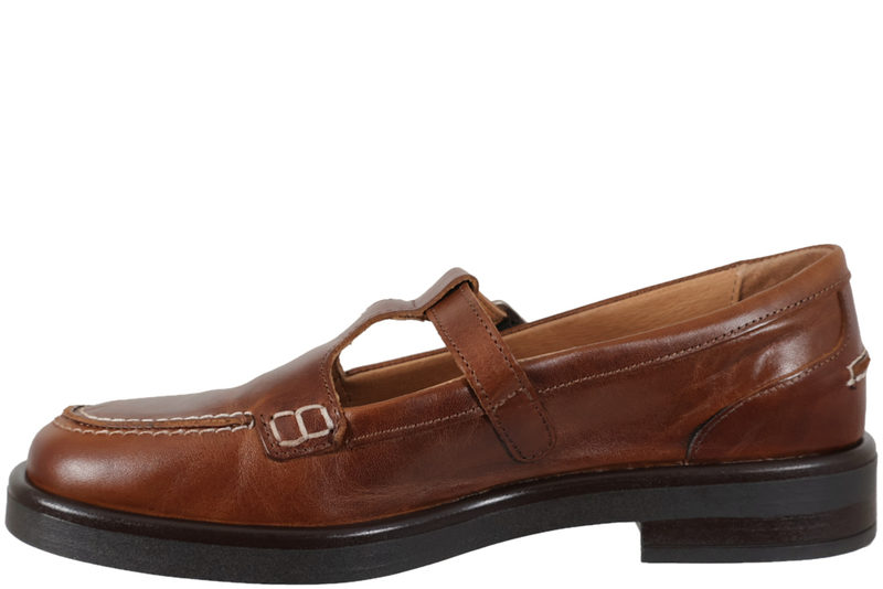 Smart loafers fra Pavement til dame. Skoen er lavet af brunt glat skind og har en rem henover vristen, der justeres med spænde lukning. Indvendig er den foret med skind og har en blød dæksål. Slidsålen er lavet af sort gummi, så man står godt fast. En lækker loafers der kan bruges til lidt af hvert.