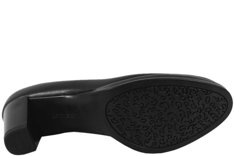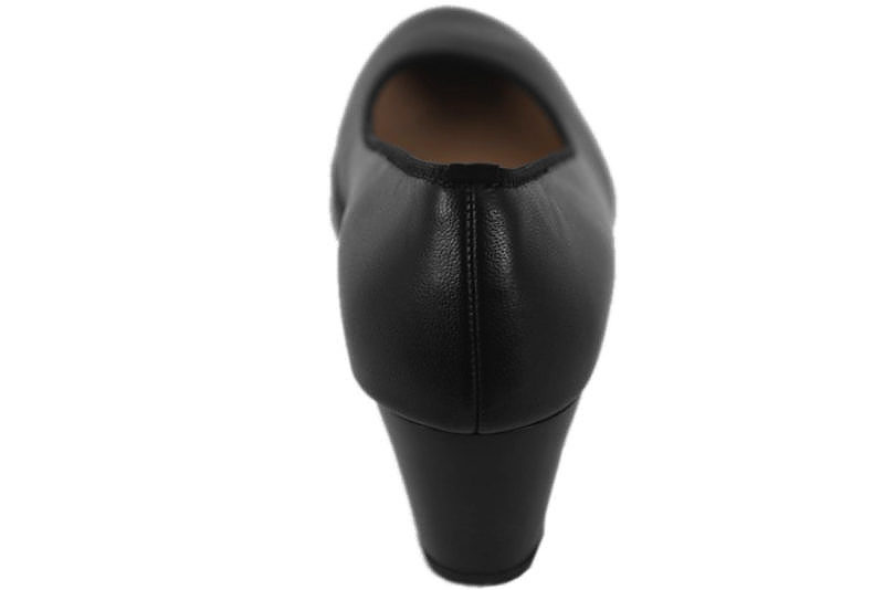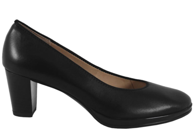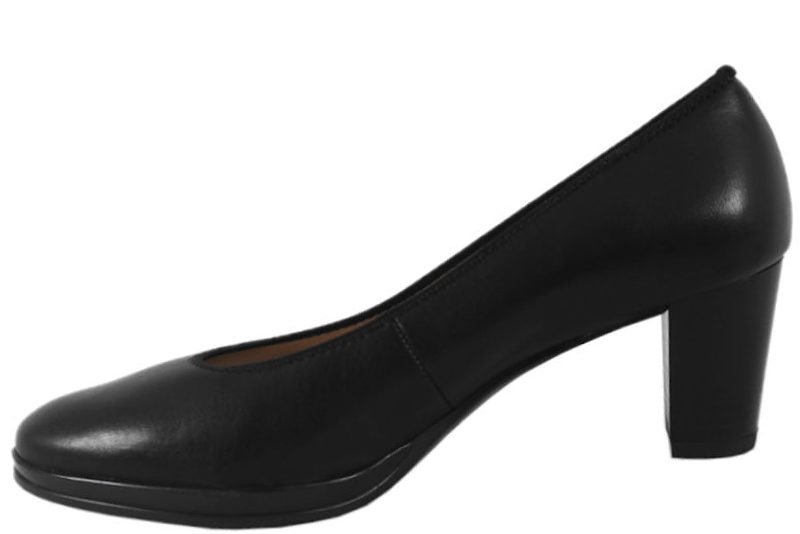 Rigtig god pump fra Ara. Den er lavet af sort glat skind, som giver et flot og enkelt udtryk. Indvendigt er den foret med lyst skind og har en High Soft dæksål i skind. Slidsålen er en sort gummisål. Hælen måler 5 cm.Den har en elastik kan rundt i udskæringen som gør at den ikke er skarp i kanterne. Perfekt sko til jobsko og festsko