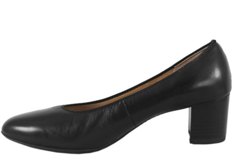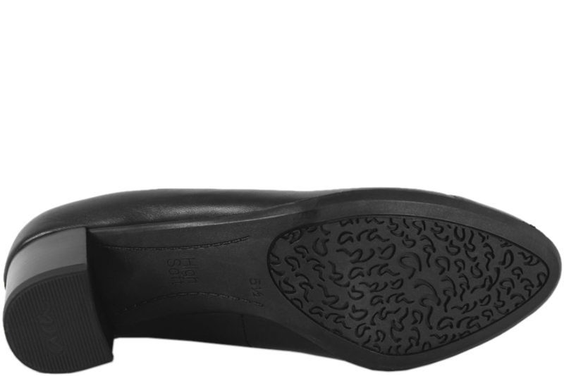 Super god pumps fra Ara. Skoen er i sort skind. Indvendigt er den foret med lyst skind og har en High Soft dæksål, som gør skoen rigtig behagelig at gå med. Skoens hæl måler 5 cm. og er overtrukket, så den ligner en glat træhæl. Slidsålen er en sort gummisål. Rigtig god og behagelig sko fra Ara, som kan bruges til mange anledninger.