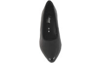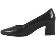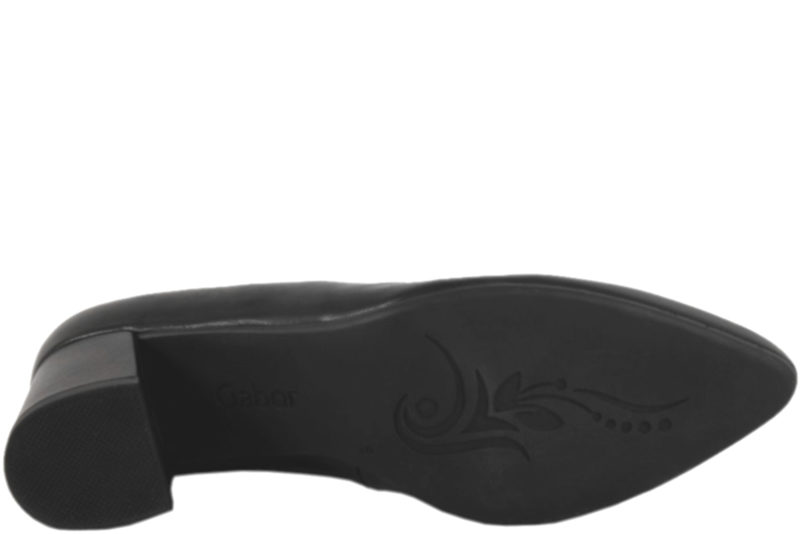 Sort pumps i glat skind på en skindbetrukket hæl. Hælen måler 5,8 cm. Den er en anelse slank i tåen, hvilket giver et flot look. Rundt i kanten er der elastik, hvilket gør at den ikke er skarp mod huden. Indvendigt er den foret med skind. Og under forfoden er der en lækker blød pude at træde på. Fantastisk pasform.
