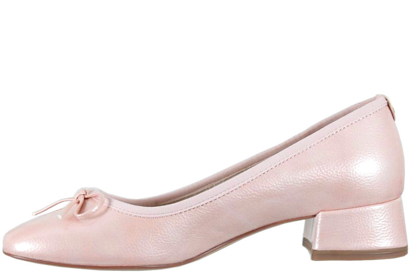 Elegant rosafarvet pumps fra Tamaris til damer. Skoen er lavet af rosa lak, med elastik langs kanten. Skoen har en firkantet snude med en fin rosa sløjfe. Indvendigt er den foret med lyst tekstil og har den velkendte "Touch it" sål, der er dejlig behagelig at træde på. Slidsålen er lavet af PVC. Hælen måler 3 cm.