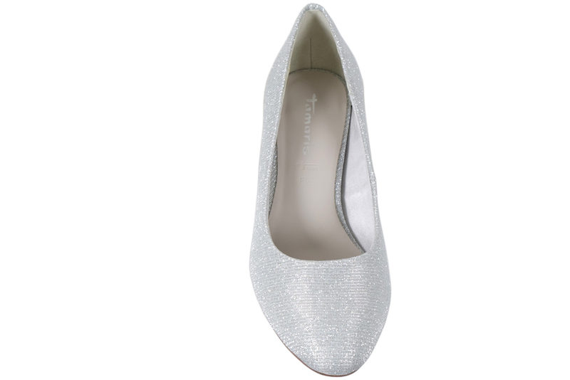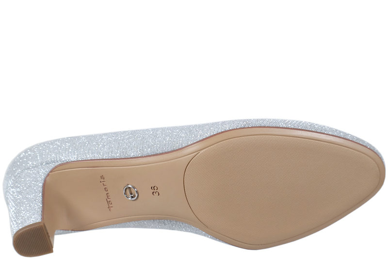 Super smart pump fra Tamaris. Den er lavet af sølvfarvet tekstil. Indvendigt er den foret med hvidt tekstil og har en Touch It sål, der er blød at træde på. Slidsålen er af beige PVC. Denne model er med en lille hæl der måler 6 cm. Super flot og enkel pump til dame.