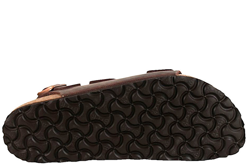 Super smart sandal fra Birkenstock til damer. Sandalen er lavet af mørkebrunt olieret skind. Foran er der to remme, som kan justeres med et spænde, så den sidder godt ind til foden. Bagpå er der en hælrem, som kan justeres med et spænde. Indvendigt er den foret med ruskind og har en dæksål med svangstøtte i ruskind. Slidsålen er en sort EVA sål.