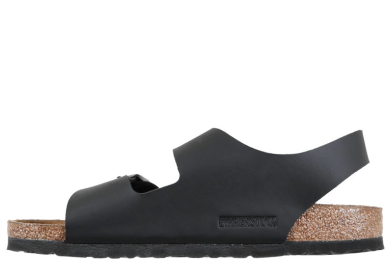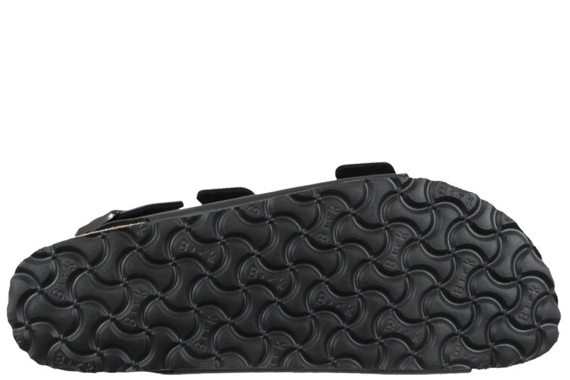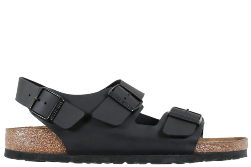 Smart sort sandal fra Birkenstock. Modellen hedder Milano BS og har to remme henover foden og en rem rundt om hælen. Sandalen er med tre spænder, en på hver rem, som du selv kan justere efter eget behov. Den er lavet i birkoflor. Dæksålen er lavet i skind, mellemsålen i kork og slidsålen i sort EVA. Birkenstock produkter er helt unikke. Birkenstock er anatomisk opbygget og giver foden den optimale støtte. Birkenstocks særlige udformning aflaster kroppen og fordeler belastningen rigtigt - derfor går du altid godt i et par Birkenstock. Narrow fit: Dette er den smalle model.