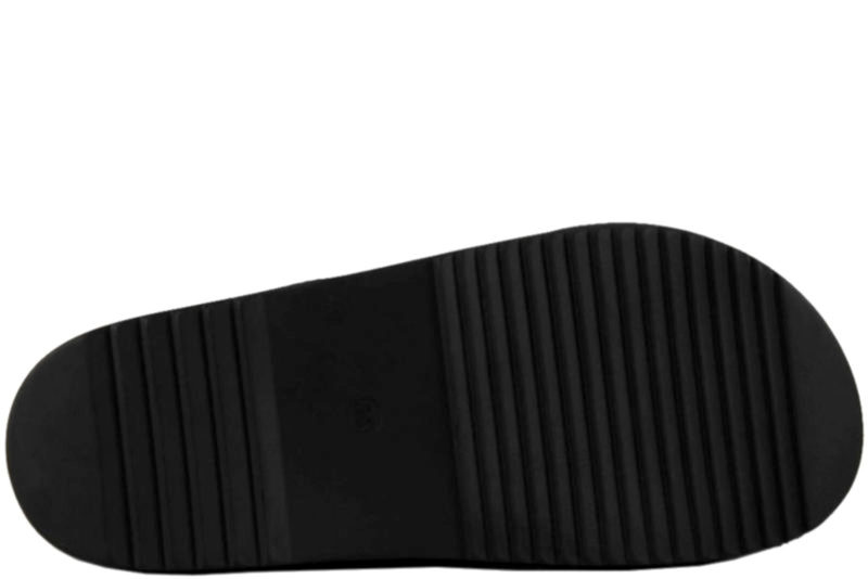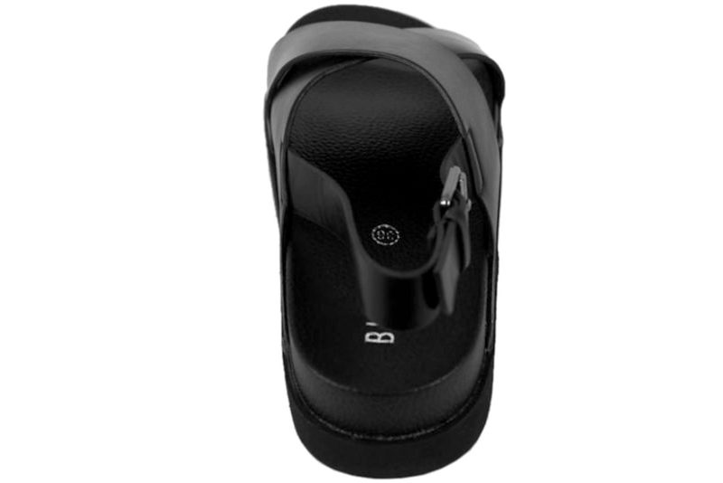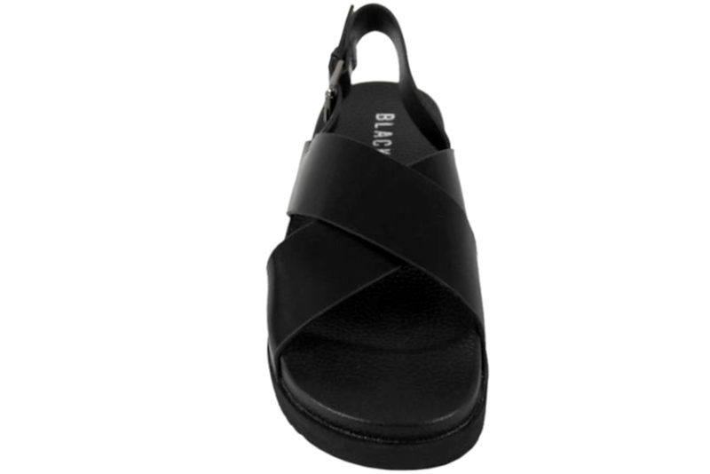 Smart og enkel sandal fra Black. Sandalen er lavet i sort PU. Sandalen har to remme, som krydser over forfoden og giver et elegant look. Skoen er med bagrem, hvorpå der er et spænde, som kan reguleres efter foden. Indvendigt er skoen foret med sort PU, dæksålen er også af sort PU. Slidsålen er af sort EVA. Meget fin sandal til damer.