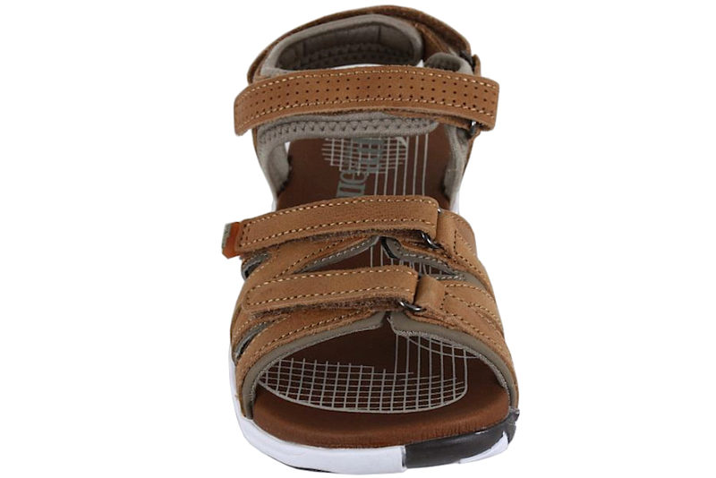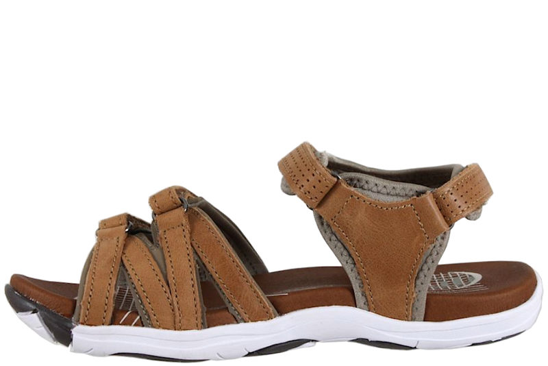 Cognacfarvet sandal med lyse detaljer. Der er to justerbare velcroremme over forfoden. Der er en justerbar velcrorem over vristen, samt en rem bag hælen. Remmene er polstret på bagsiden, så de er bløde mod huden. Dæksålen er stødabsorberende og super behagelig at gå på. Slidsålen er en hvid gummisål. Sandalen fra Green Comfort er yderst velegnet til arbejdsbrug eller som sandal til hverdagen.